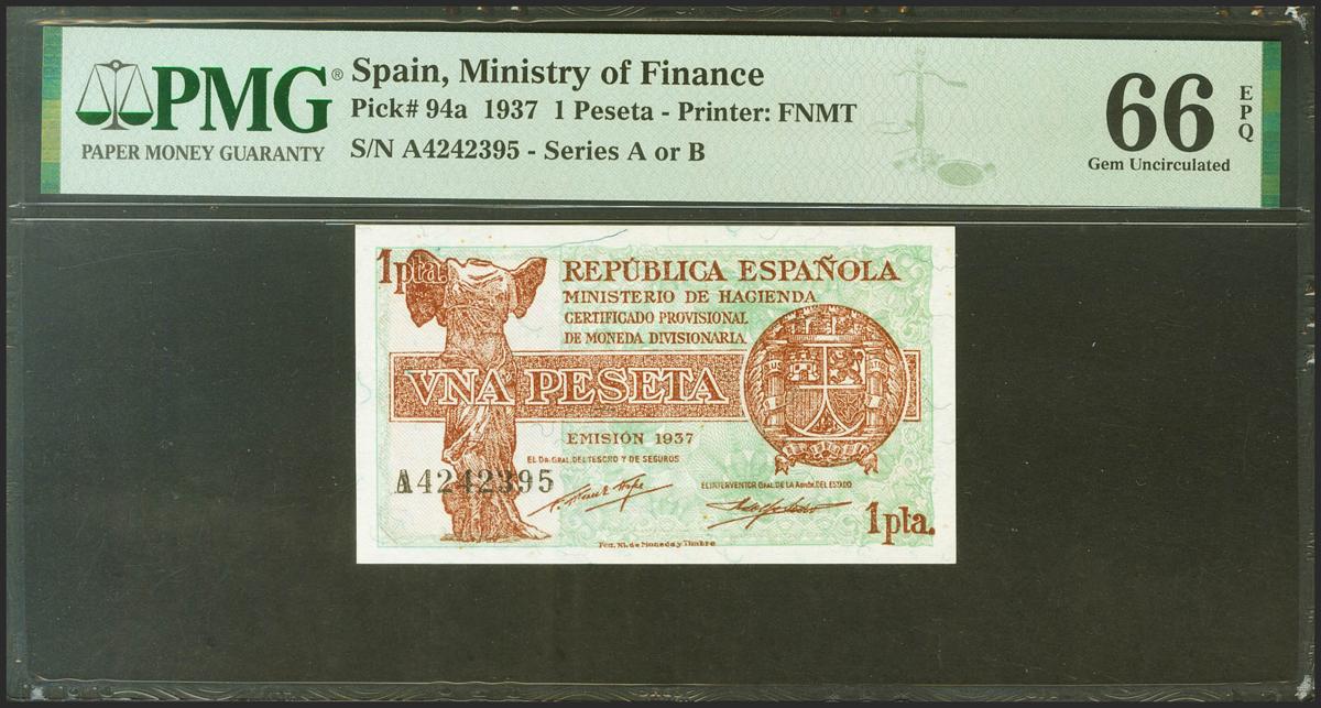 1 Peseta. 1937. Ministerio de Hacienda. Serie A. (Edifil 2021: 392, Pick: 94a). Apresto original. SC. Encapsulado PMG66EPQ.