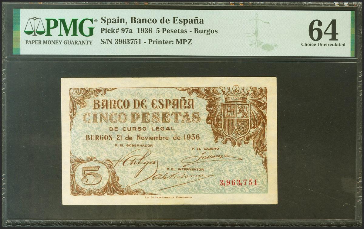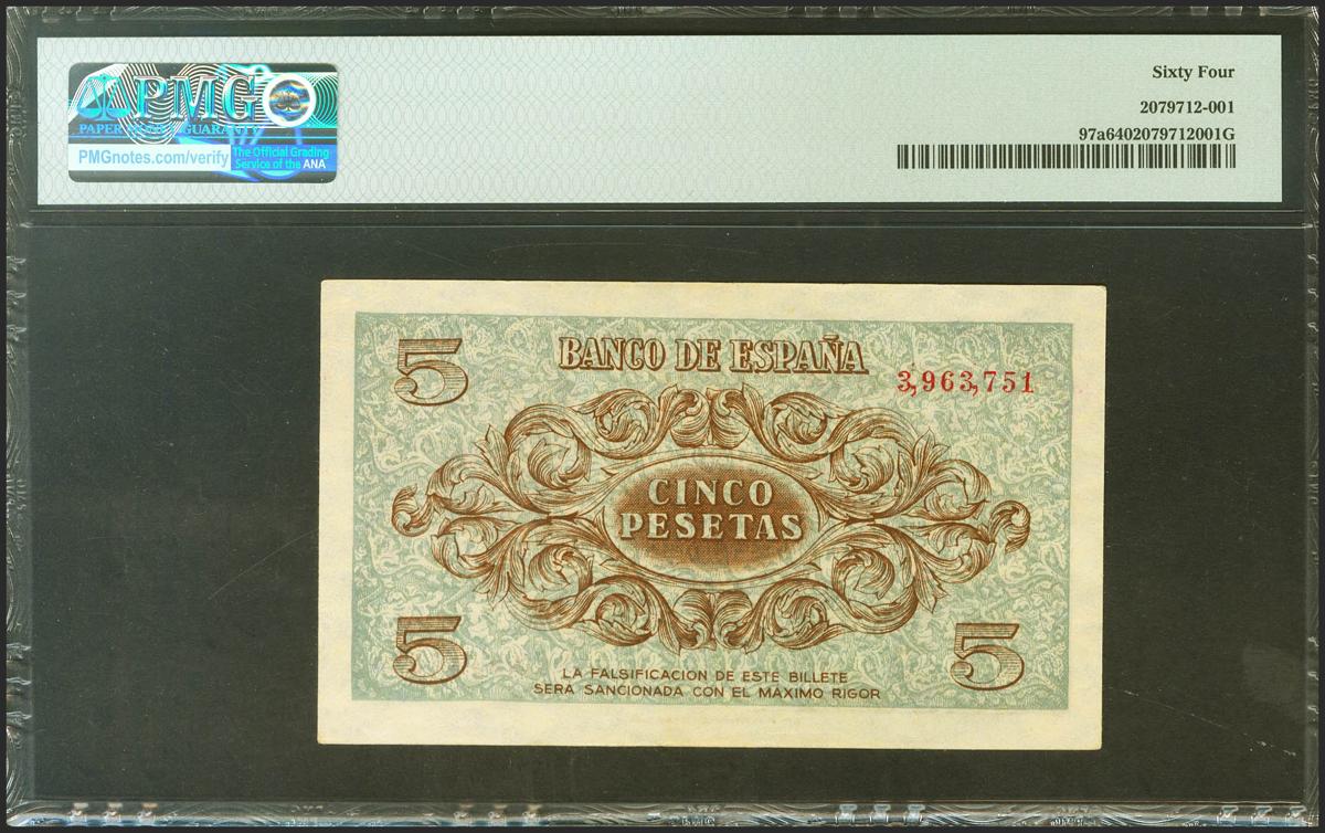 5 Pesetas. 21 de Noviembre de 1936. Sin serie. (Edifil 2021: 417, Pick: 97a). Rarísimo en esta excepcional calidad. SC. Encapsulado PMG64. (Para hacerse una idea de la rareza de este billete en esta calidad, PMG otorga a día 1 de Marzo de 2023, la tercera mejor calificación compartiéndola con otros nueve billetes).