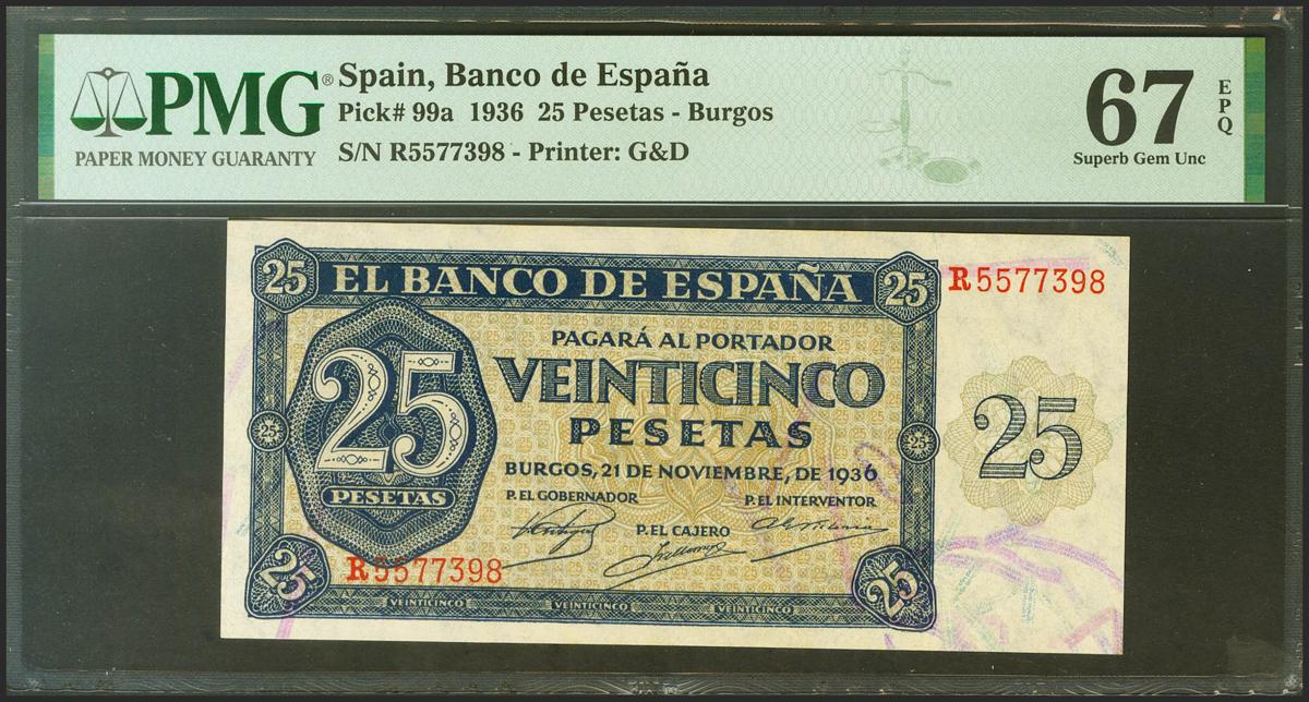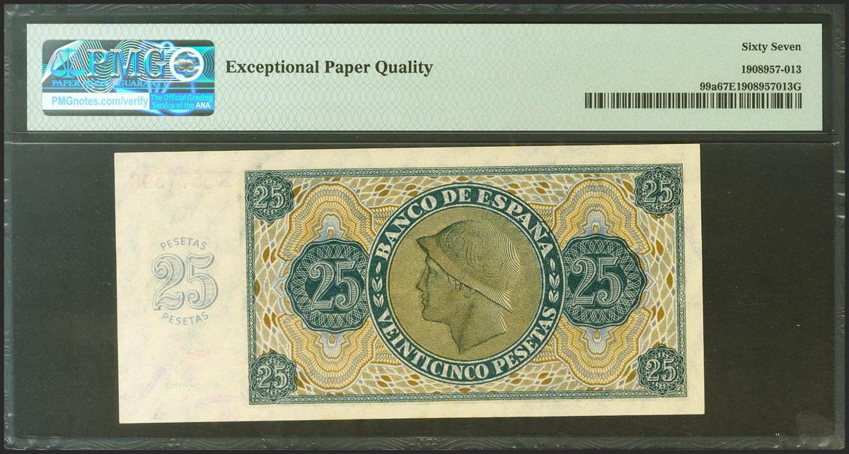 25 Pesetas. 21 de Noviembre de 1936. Serie R. (Edifil 2021: 419a, Pick: 99a). Rarísimo en esta excepcional calidad, apresto original. Encapsulado PMG67EPQ.