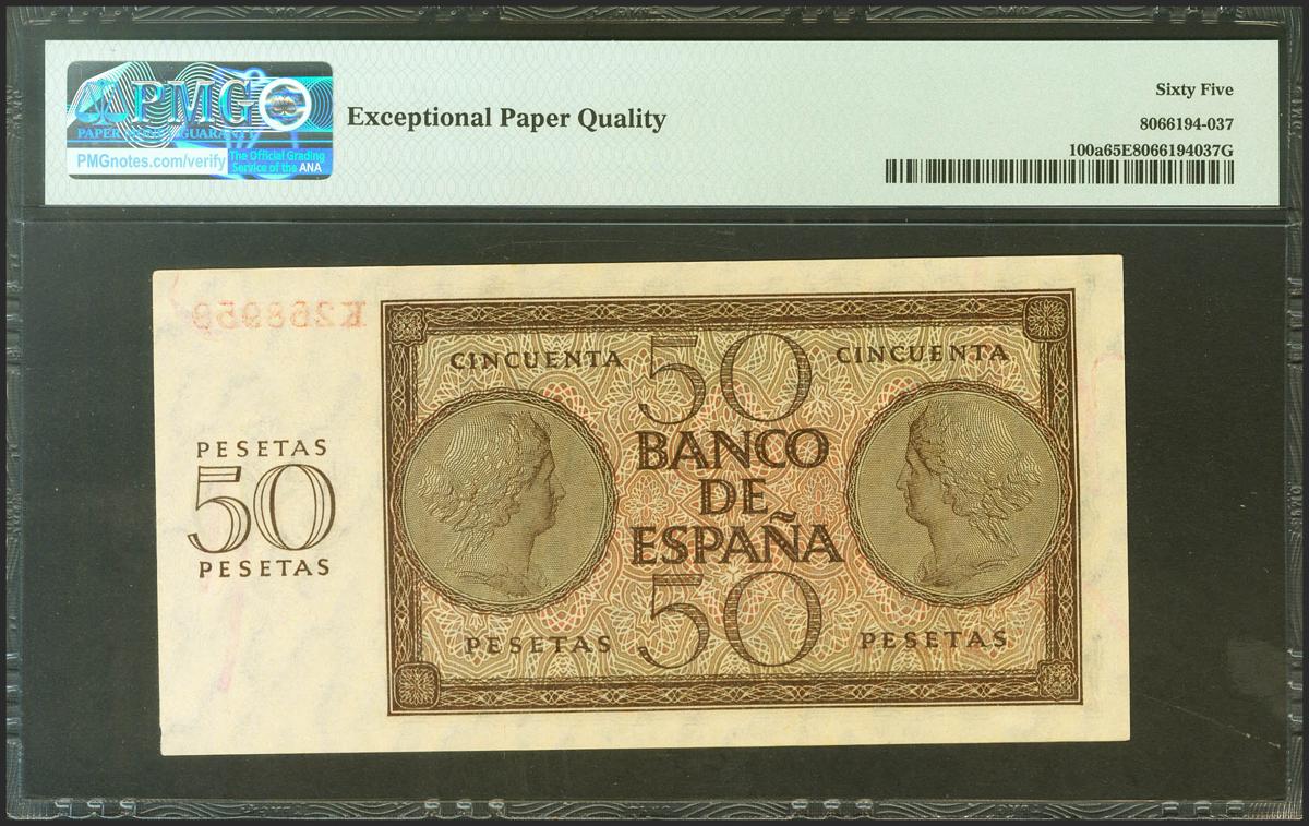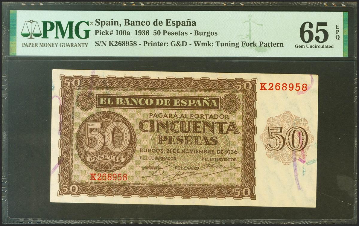 50 Pesetas. 21 de Noviembre de 1936. Serie K. (Edifil 2021: 420a, Pick: 100a). Inusual en esta excepcional calidad, apresto original. SC. Encapsulado PMG65EPQ.