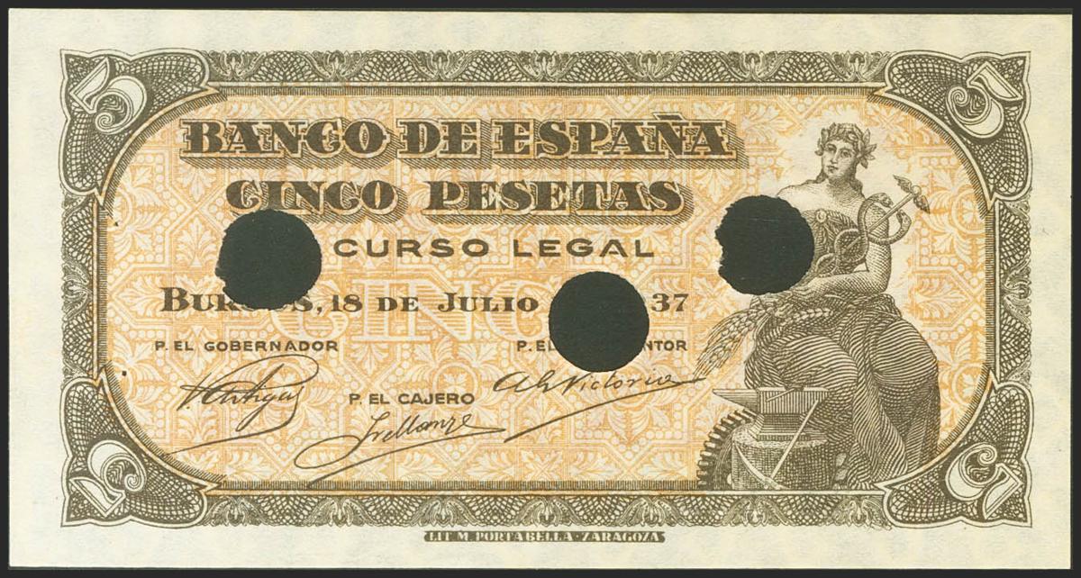 5 Pesetas. 18 de Junio de 1937. Serie C, última serie emitida, error en la numeración al dorso que presenta dos saltos en los dígitos de las decenas y unidades, taladrado tres veces y con puntitos de grapa. (Edifil 2021: 424a). Rarísimo, apresto original. SC-.