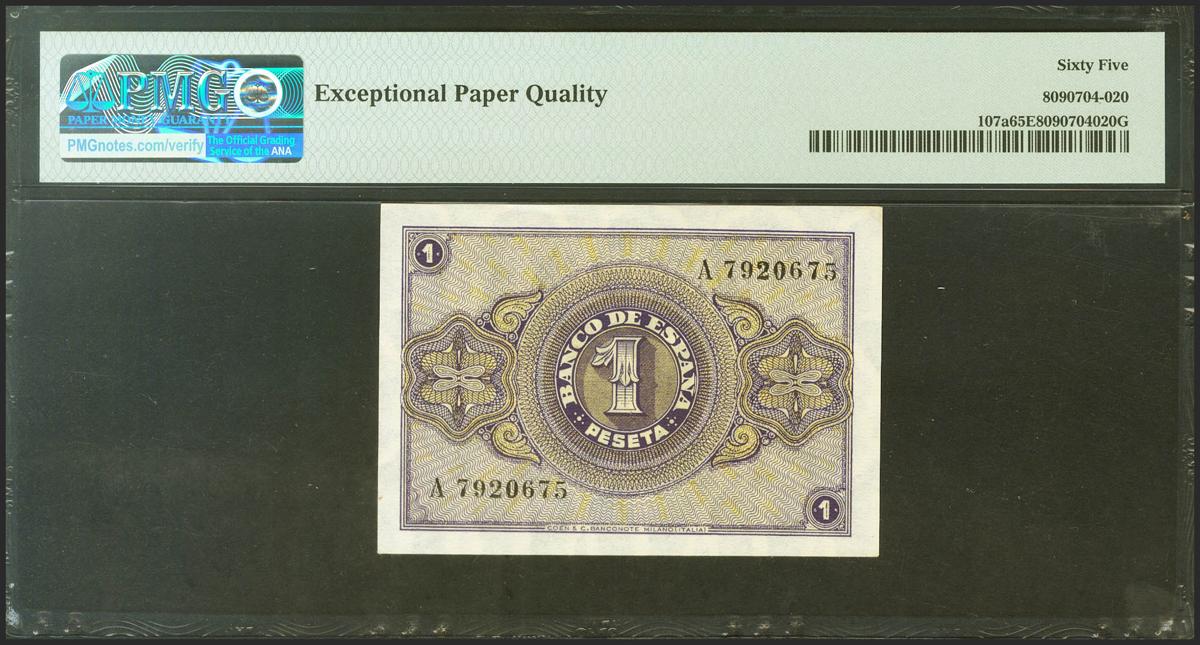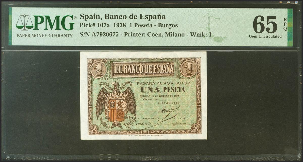 1 Peseta. 28 de Febrero de 1938. Serie A. (Edifil 2021: 427, Pick: 107a). Apresto original. SC. Encapsulado PMG65EPQ.