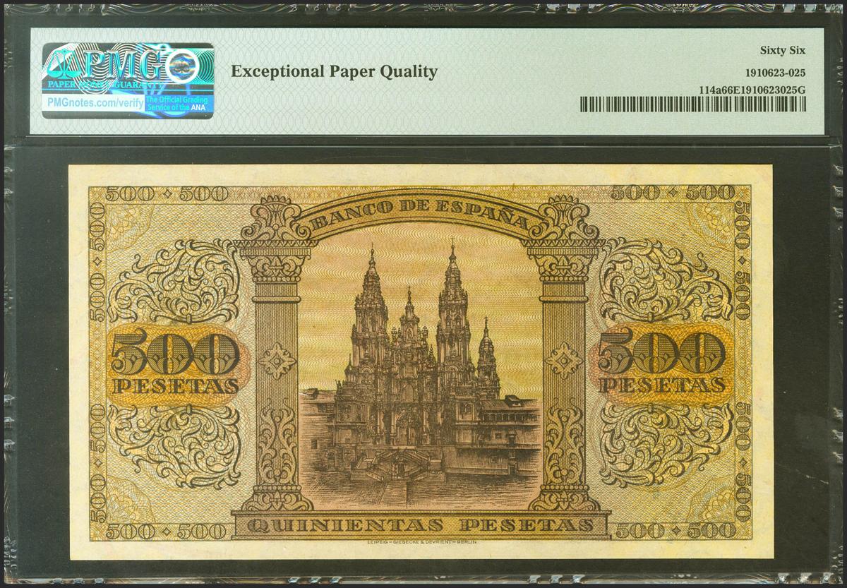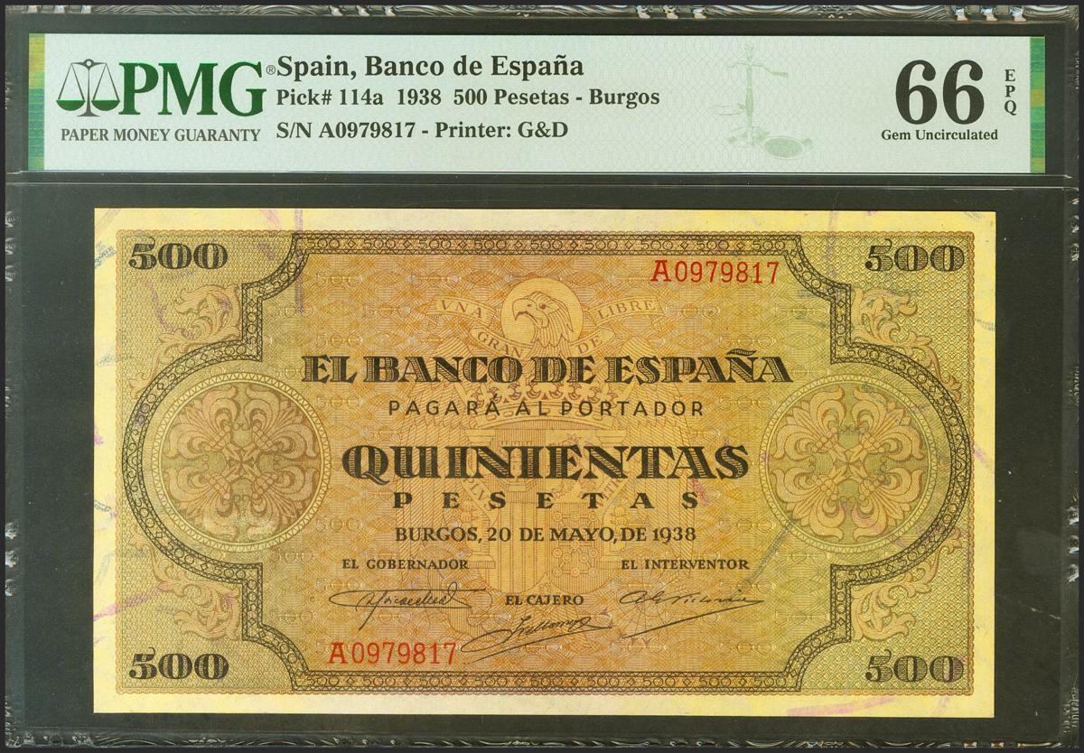 500 Pesetas. 20 de Mayo de 1938. Serie A. (Edifil 2021: 433, Pick: 114a). Rarísimo en esta excepcional calidad, apresto original. SC. Encapsulado PMG66EPQ. (para hacernos una idea de la rareza de este billete, a fecha 1 de Marzo de 2022, es el segundo mejor calificado junto a otros once billetes en PMG)