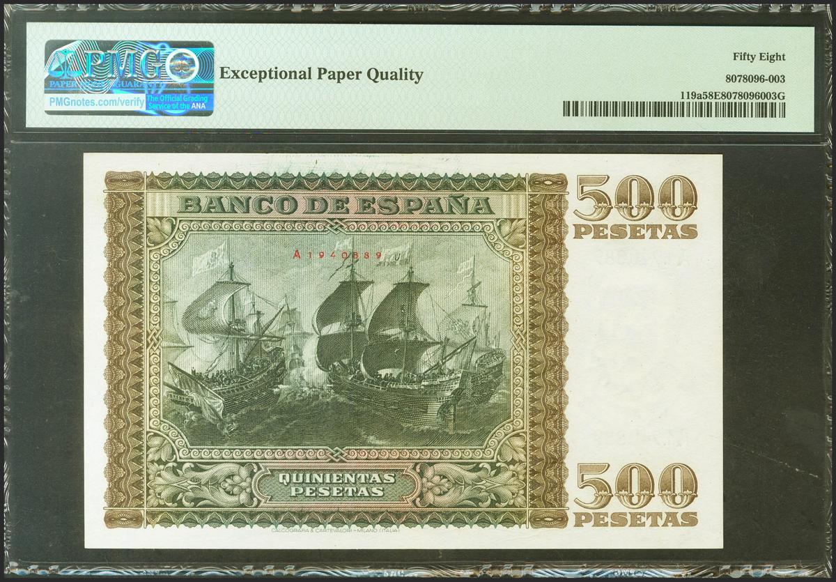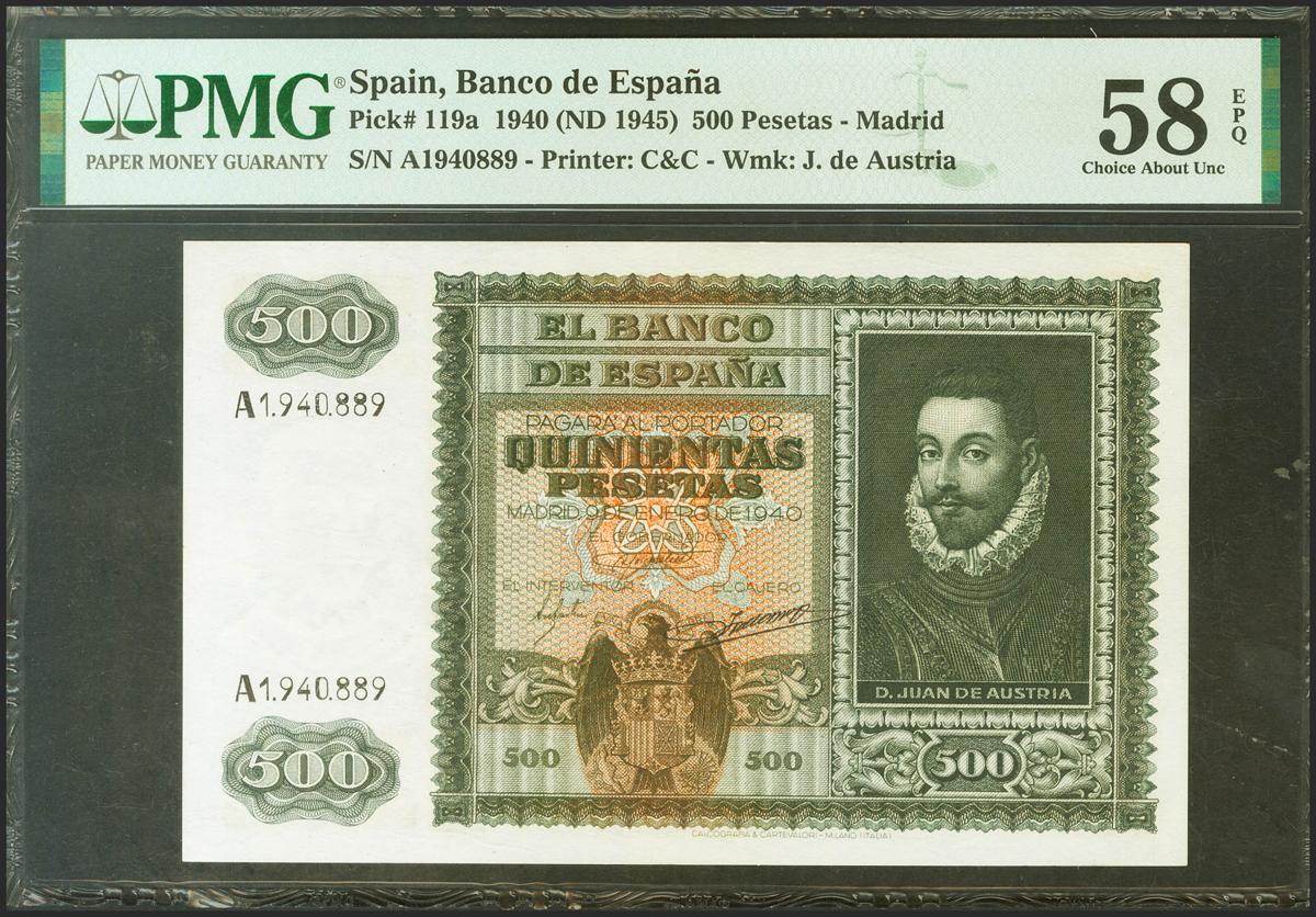 500 Pesetas. 9 de Enero de 1940. Serie A. (Edifil 2021: 439, Pick: 119a). Inusual en esta calidad, apresto original. EBC+++. Encapsulado PMG58EPQ.