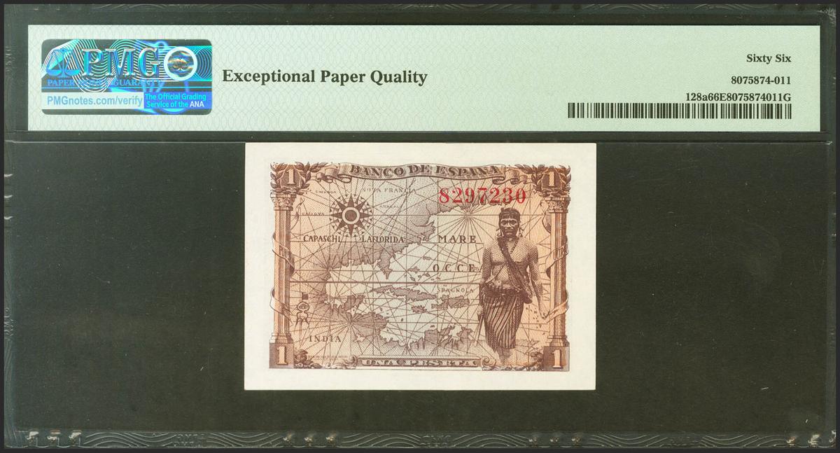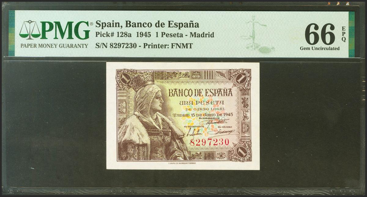 1 Peseta. 15 de Junio de 1945. Sin serie. (Edifil 2021: 448, Pick: 128a). Apresto original. SC. Encapsulado PMG66EPQ.