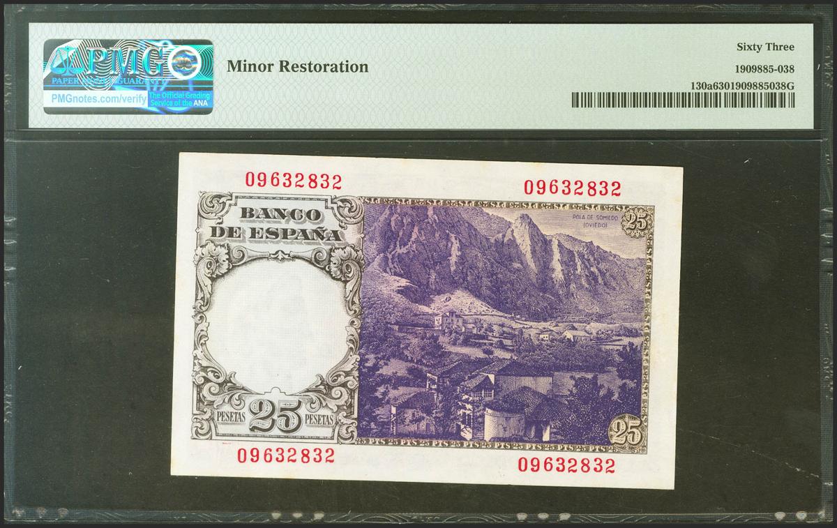 25 Pesetas. 19 de Febrero de 1946. Sin serie. (Edifil 2021: 450, Pick: 130a). Inusual en esta calidad. SC. Encapsulado PMG63.