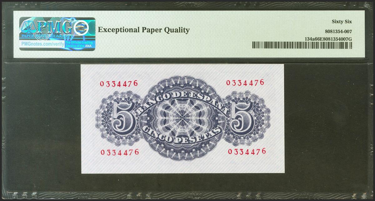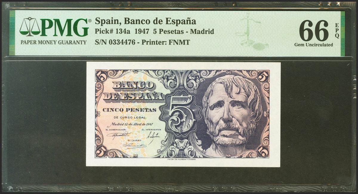 5 Pesetas. 12 de Abril de 1947. Sin serie. (Edifil 2021: 454, Pick: 134a). Raro en esta calidad, apresto original. SC. Encapsulado PMG66EPQ.