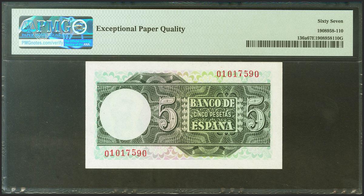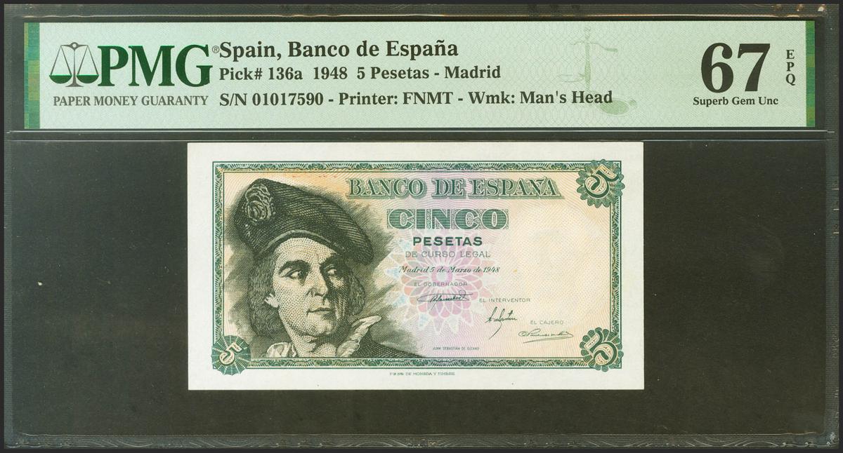 5 Pesetas. 5 de Marzo de 1948. Sin serie. (Edifil 2021: 455, Pick: 136a). Apresto original. SC. Encapsulado PMG67EPQ.