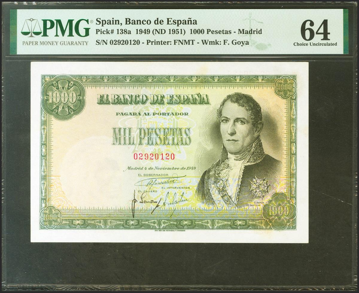 1000 Pesetas. 4 de Noviembre de 1949. Sin serie. (Edifil 2021: 458, Pick: 138a). Raro en esta excepcional calidad. SC. Encapsulado PMG64.