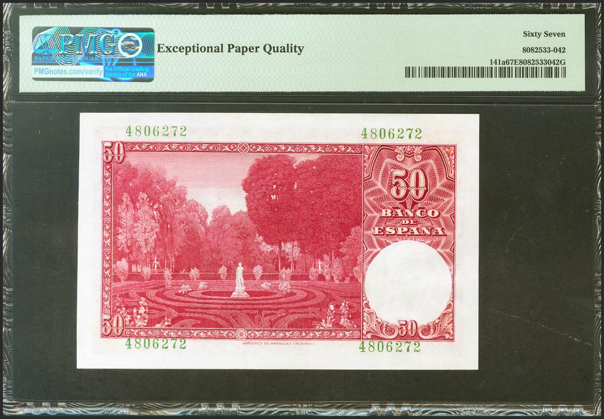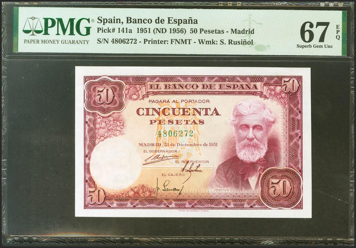 50 Pesetas. 31 de Diciembre de 1951. Sin serie. (Edifil 2021: 462, Pick: 141a). Rarísimo en esta calidad, apresto original. SC. Encapsulado PMG67EPQ.
