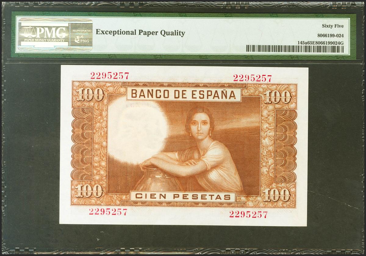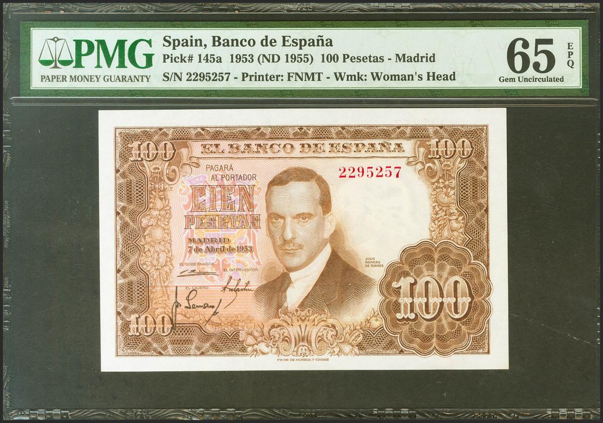 100 Pesetas. 7 de Abril de 1953. Sin serie. (Edifil 2021: 464, Pick: 145a). Inusual en esta excepcional calidad, apresto original. SC. PMG65EPQ.