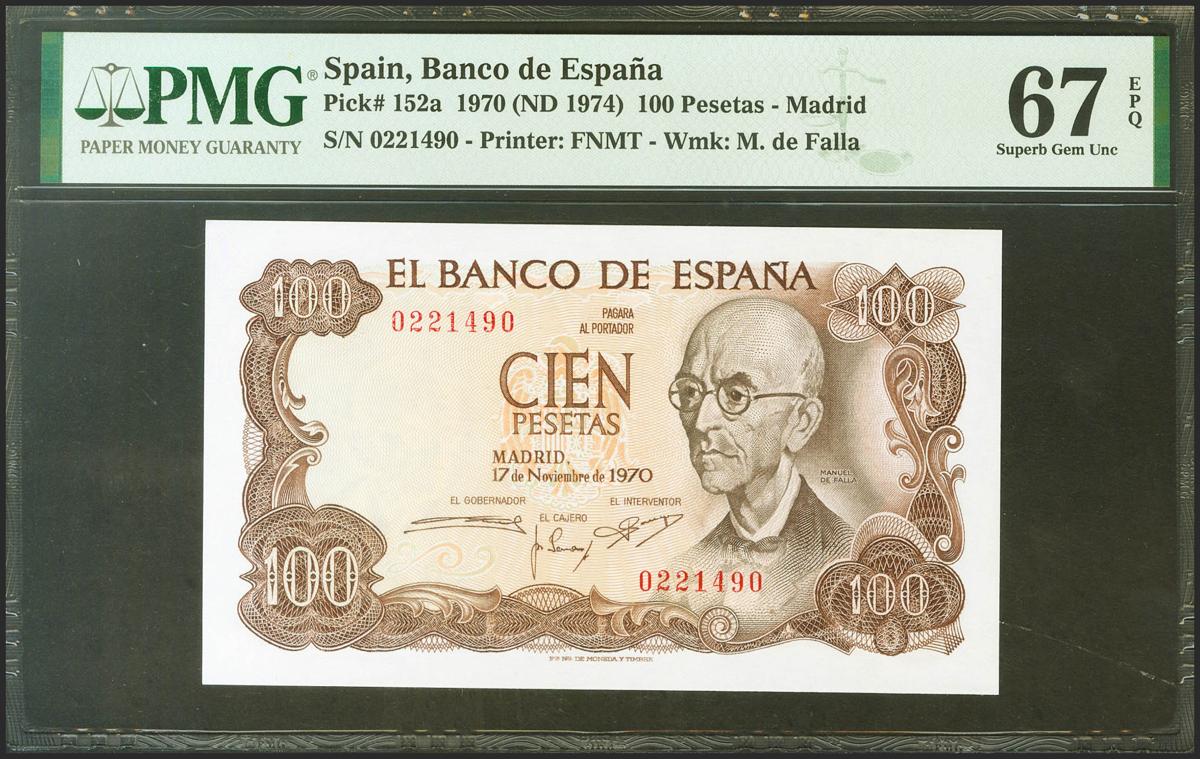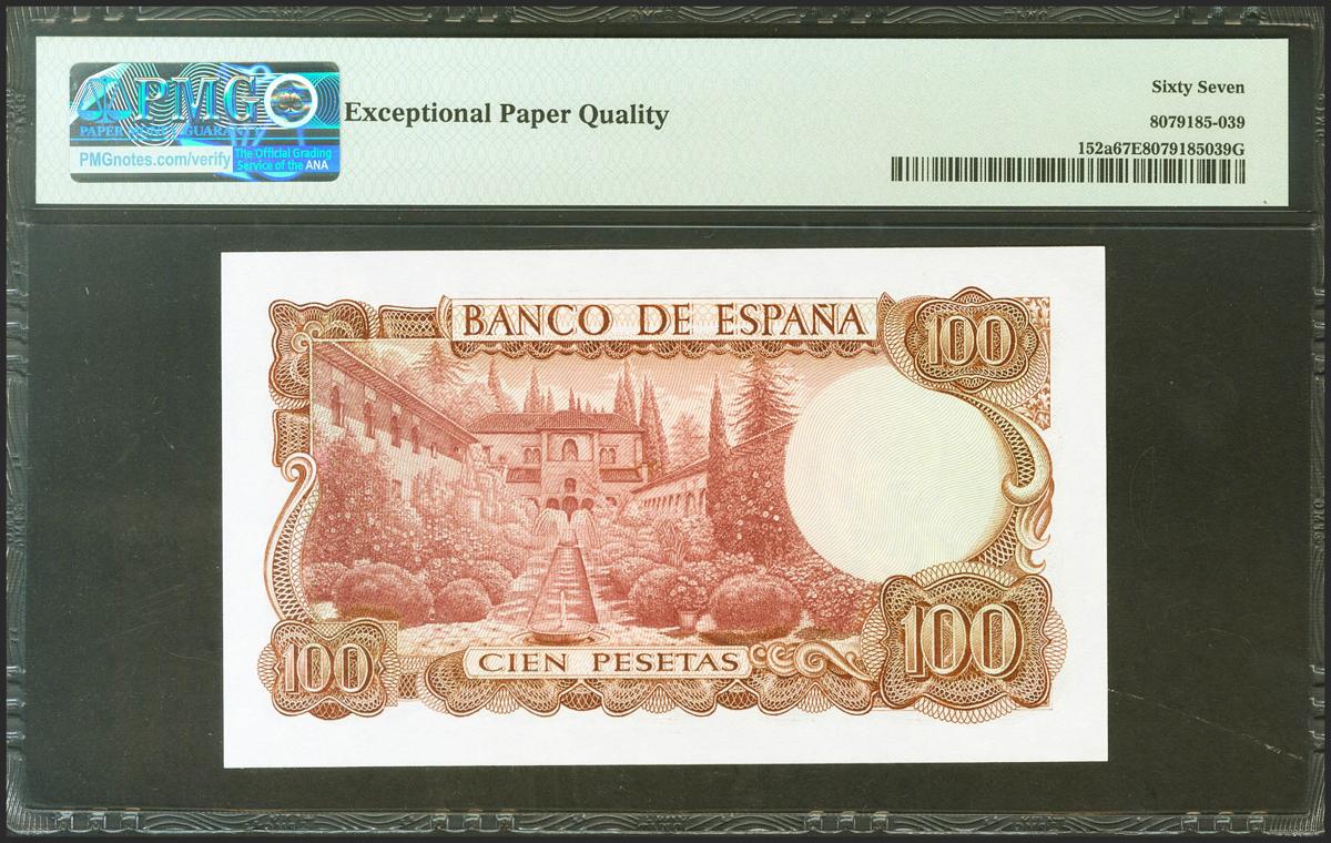 100 Pesetas. 17 de Noviembre de 1970. Sin serie. (Edifil 2021: 472, Pick: 152a). Raro en esta excepcional calidad, apresto original. SC. Encapsulado PMG67EPQ.
