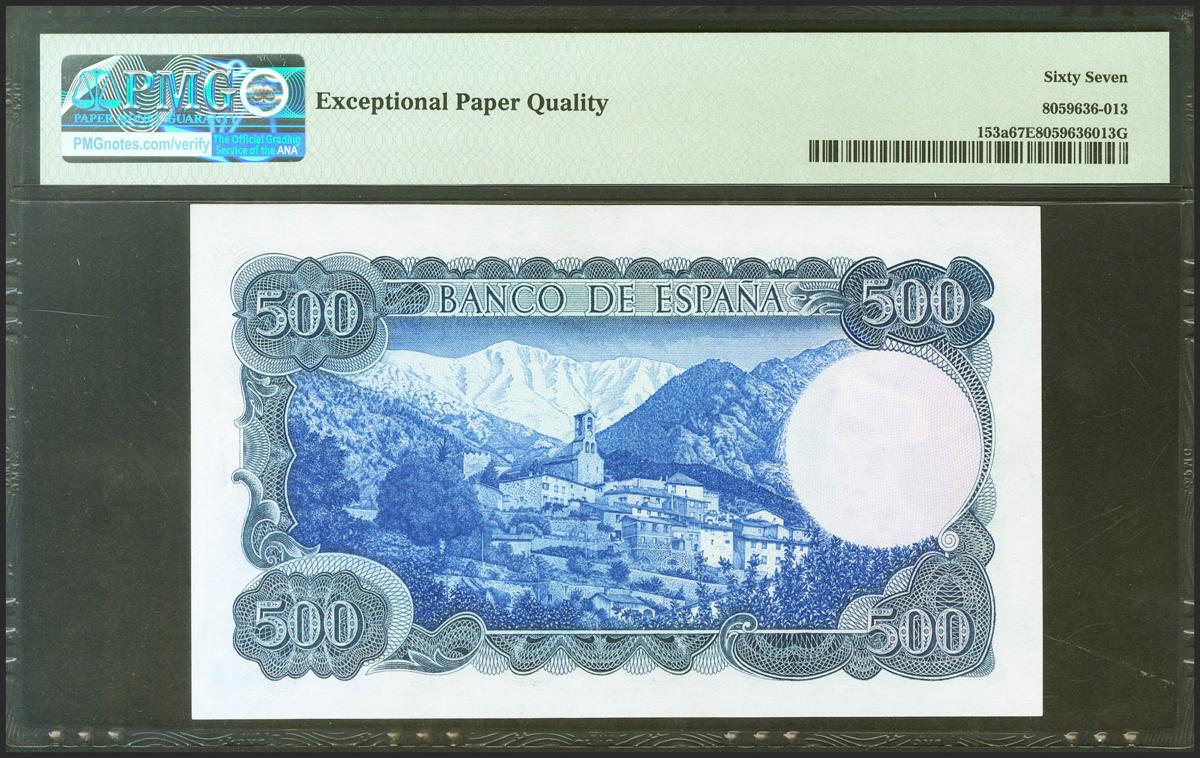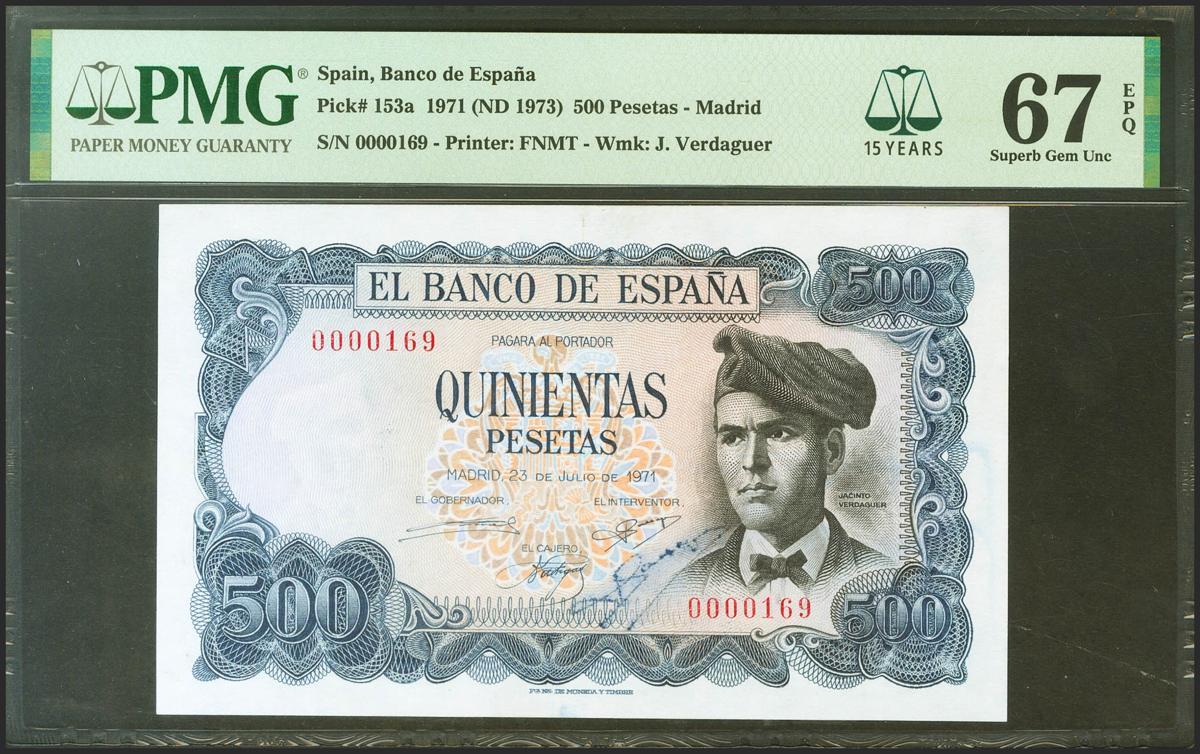 500 Pesetas. 23 de Julio de 1971. Sin serie y numeración bajísima 0000169 y con la firma manuscrita y original del inventor. (Edifil 2021: 473, Pick: 153a). Raro en esta excepcional calidad, apresto original. SC. Encapsulado PMG67EPQ.