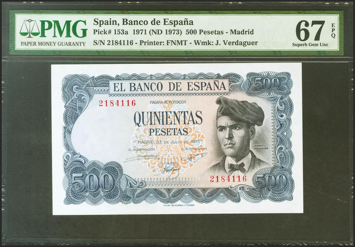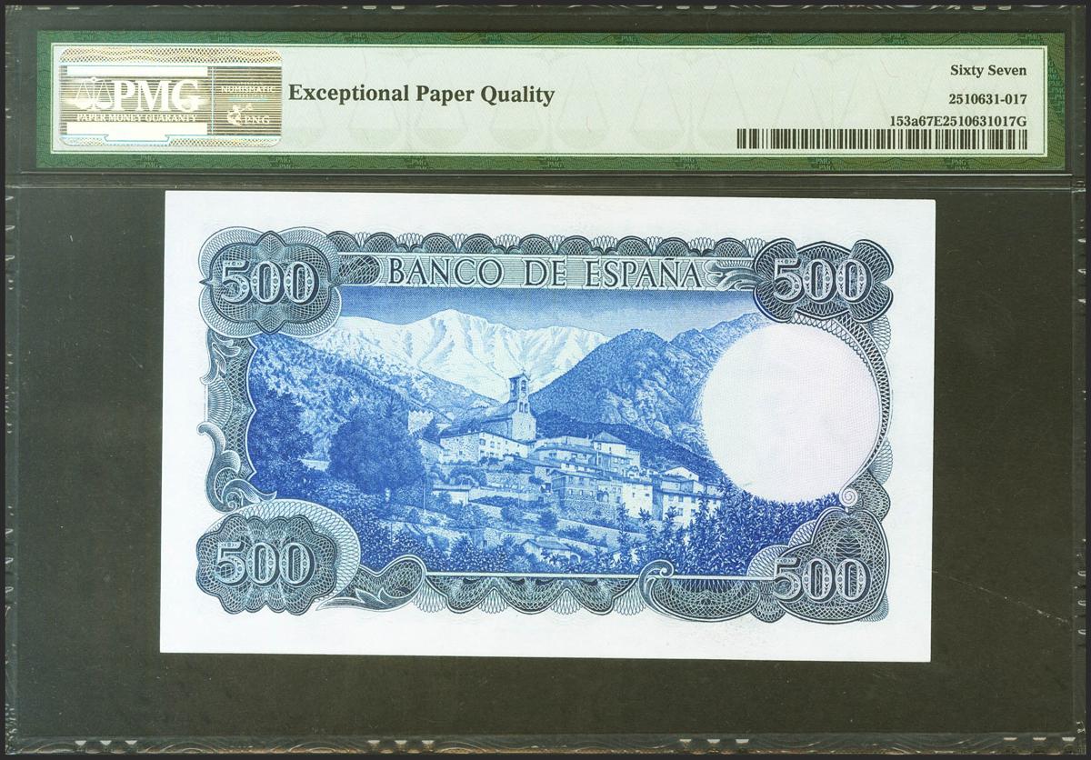 500 Pesetas. 23 de Julio de 1971. Sin serie. (Edifil 2021: 473, Pick: 153a). Raro en esta excepcional calidad, apresto original. SC. Encapsulado PMG67EPQ.
