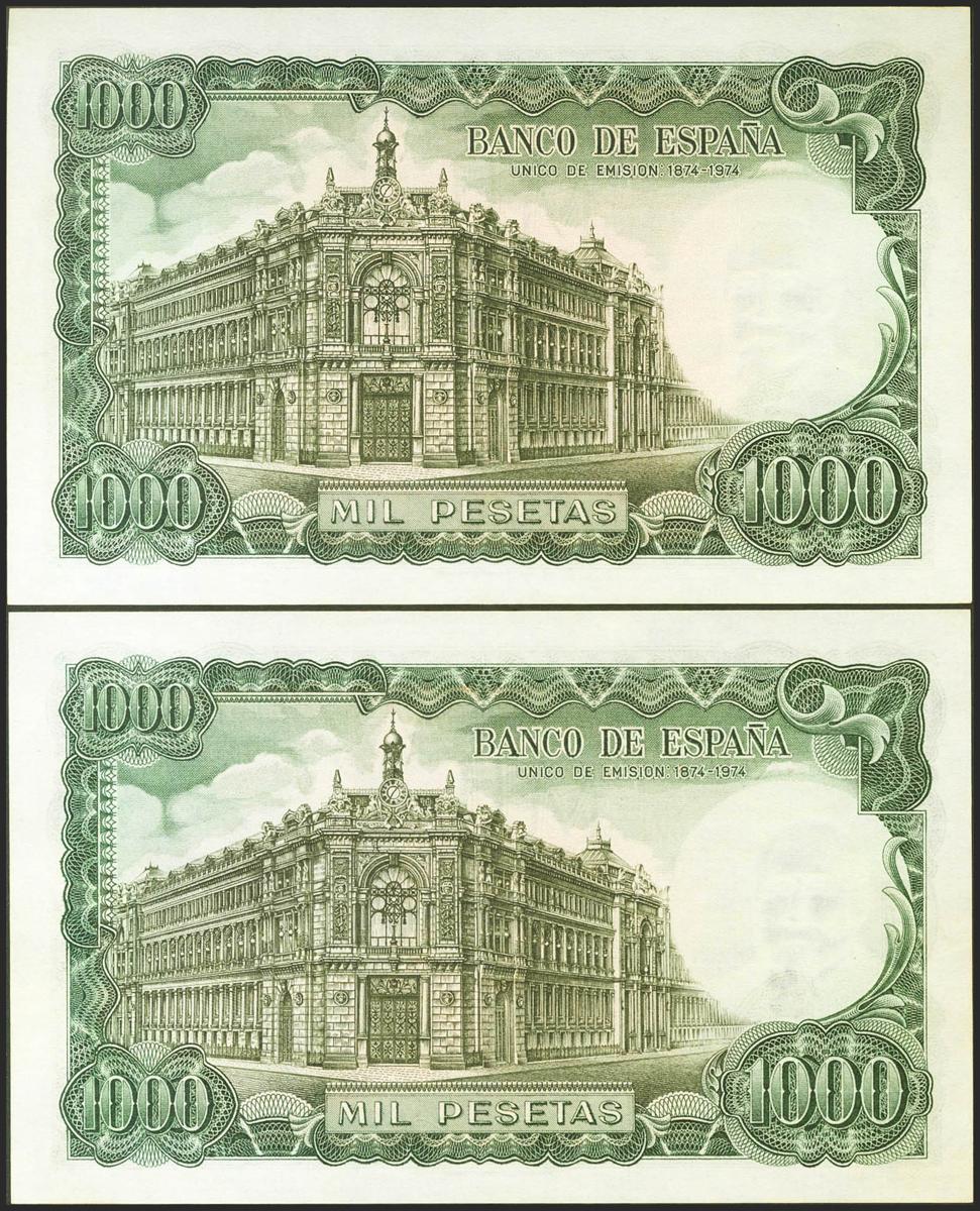 Interesante conjunto de 2 billetes de 1000 Pesetas emitidos el 17 de Septiembre de 1971, los dos con la misma numeración y serie 2F. (Edifil 2021: 474c). Raro conjunto, conserva todo su apresto original. SC-.