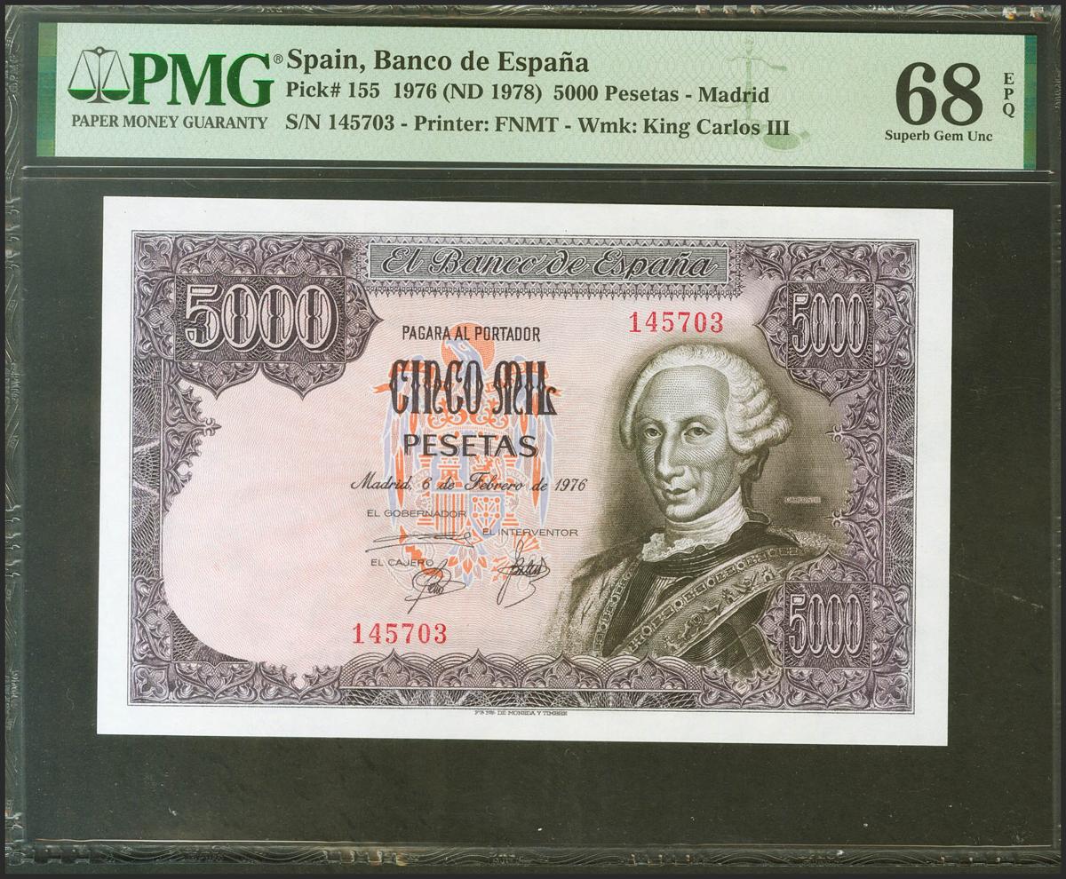 5000 Pesetas. 6 de Febrero de 1976. Sin serie. (Edifil 2021: 475, Pick: 155). Inusual en esta excepcional calidad. SC. Encapsulado PMG68EPQ.