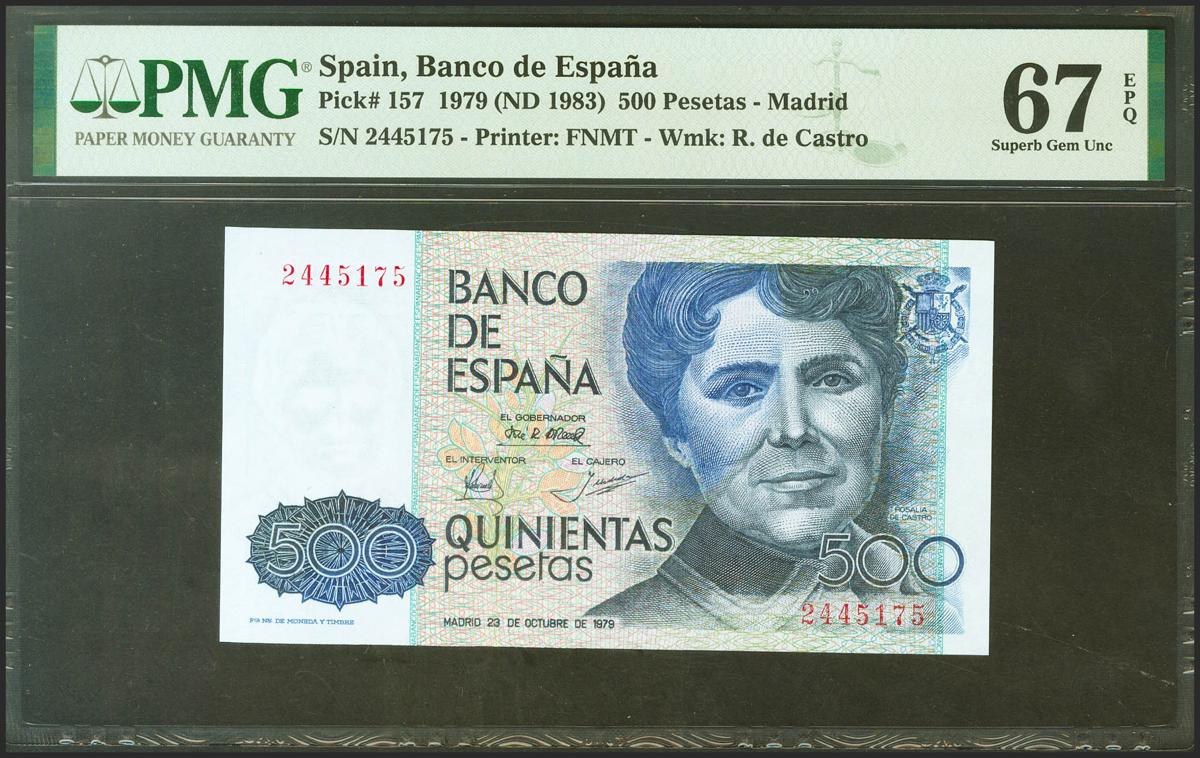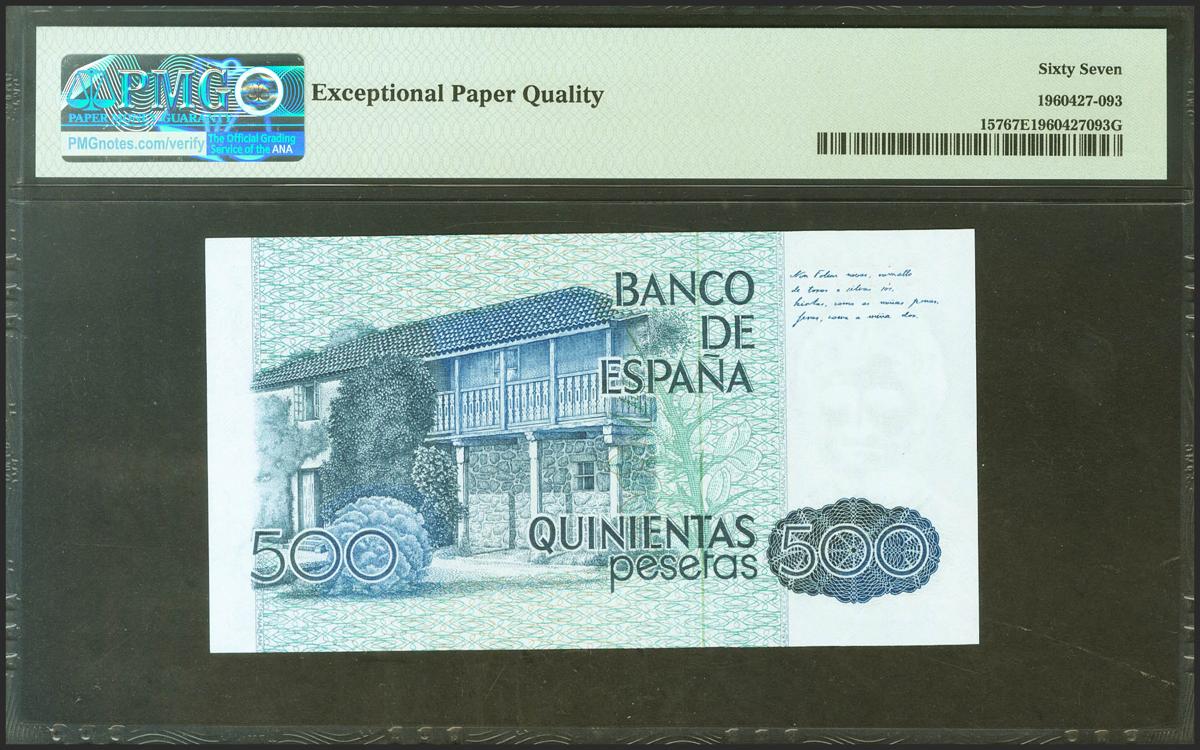 500 Pesetas. 23 de Octubre de 1979. Sin serie. (Edifil 2021: 476, Pick: 157). Inusual en esta calidad. SC. Encapsulado PMG67EPQ.