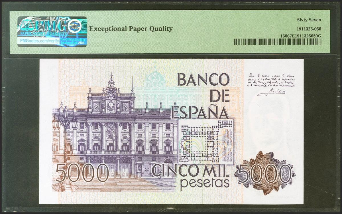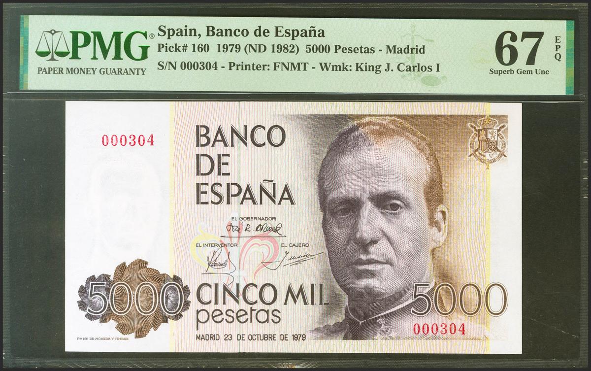 5000 Pesetas. 23 de Octubre de 1979. Sin serie y numeración bajísima (000304). (Edifil 2021: 478, Pick: 160). Raro en esta excepcional calidad. SC. Encapsulado PMG67EPQ.