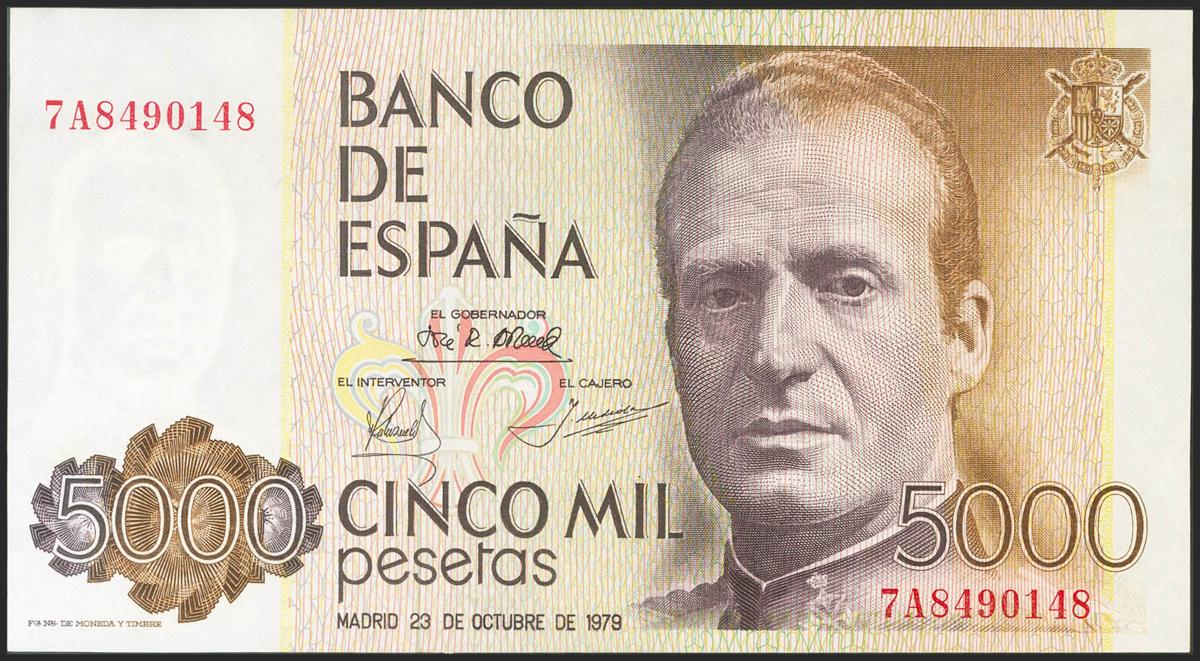 5000 Pesetas. 23 de Octubre de 1979. Error de impresión en el reverso. Serie 7A. (Edifil 2021: 478a, Pick: 160). Inusual. SC-.