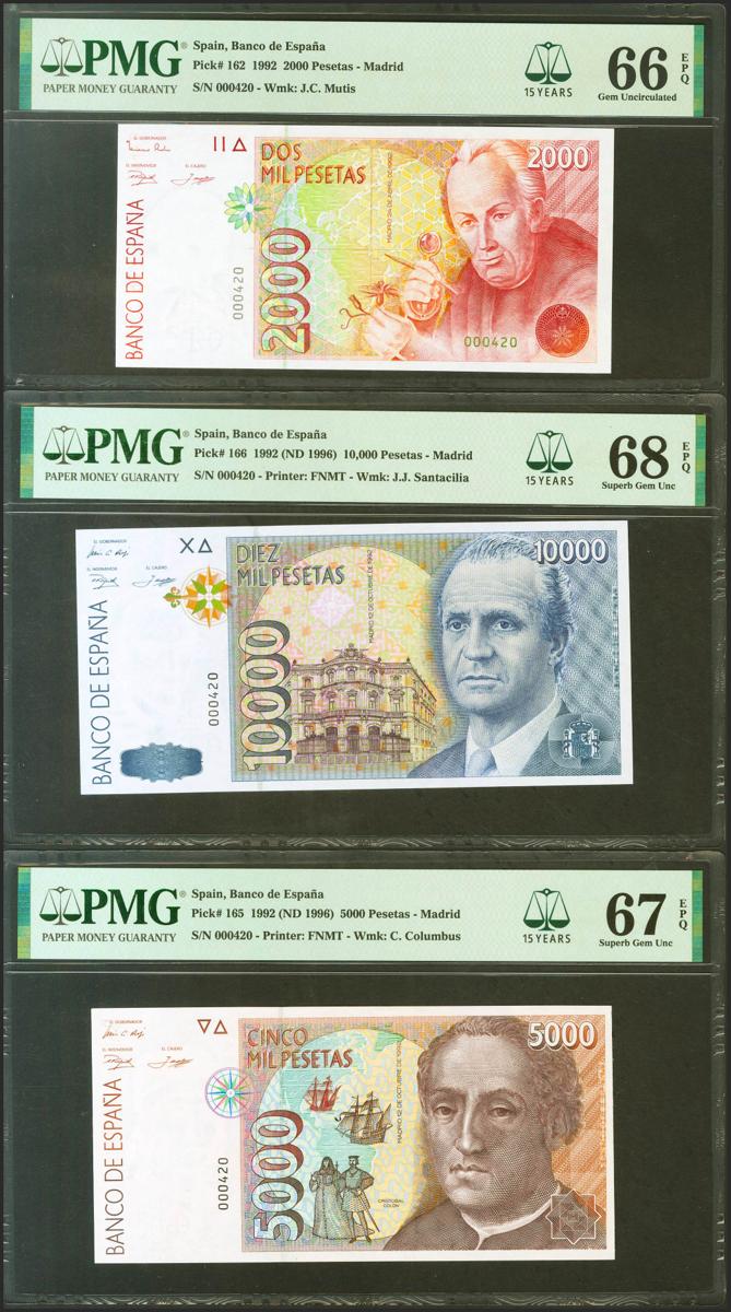 Conjunto de 5 billetes de 1000 Pesetas, 2000 Pesetas, 5000 Pesetas y 10000 Pesetas, de la emisión de 1992, todos sin serie y el 2000 Pesetas de 1992 con la serie 1S y con la misma baja numeración 000420. (Edifil 2021: 482/85). Raro conjunto. SC. Encapsulados PMG65EPQ/66EPQ/67EPQ/68EPQ/67EPQ, respectivamente.