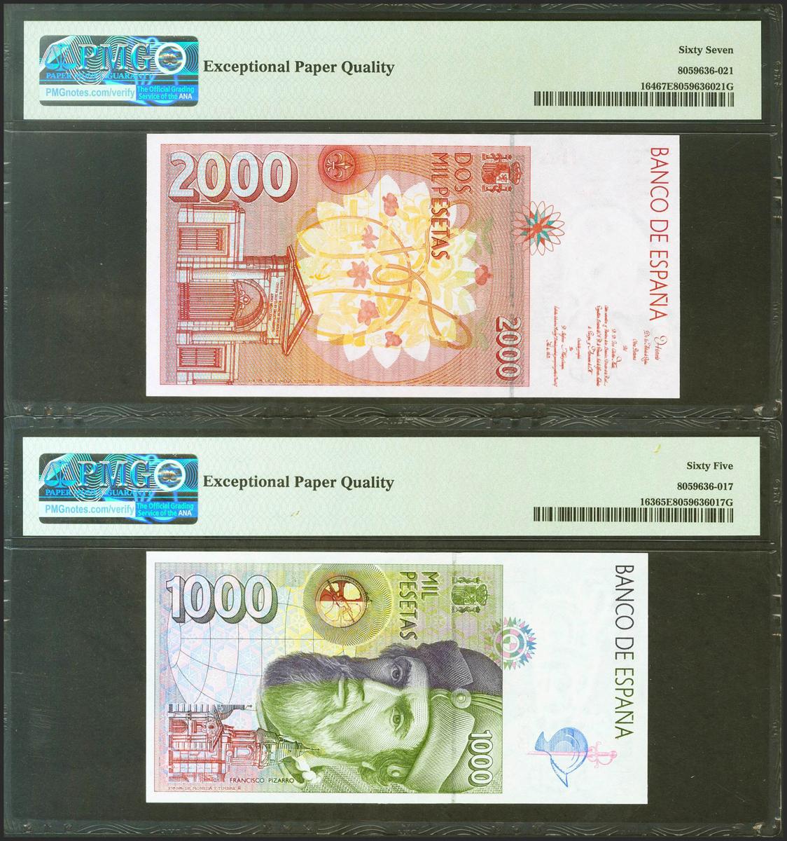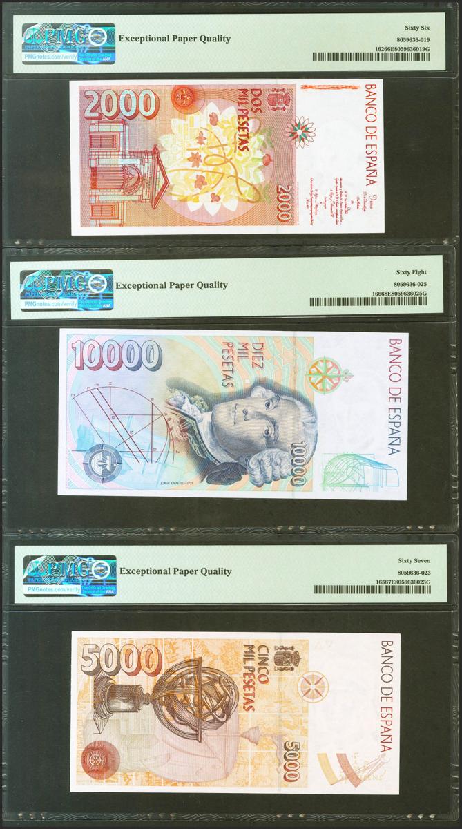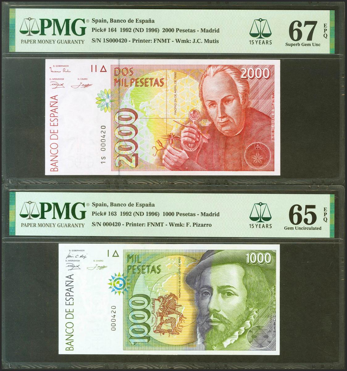 Conjunto de 5 billetes de 1000 Pesetas, 2000 Pesetas, 5000 Pesetas y 10000 Pesetas, de la emisión de 1992, todos sin serie y el 2000 Pesetas de 1992 con la serie 1S y con la misma baja numeración 000420. (Edifil 2021: 482/85). Raro conjunto. SC. Encapsulados PMG65EPQ/66EPQ/67EPQ/68EPQ/67EPQ, respectivamente.