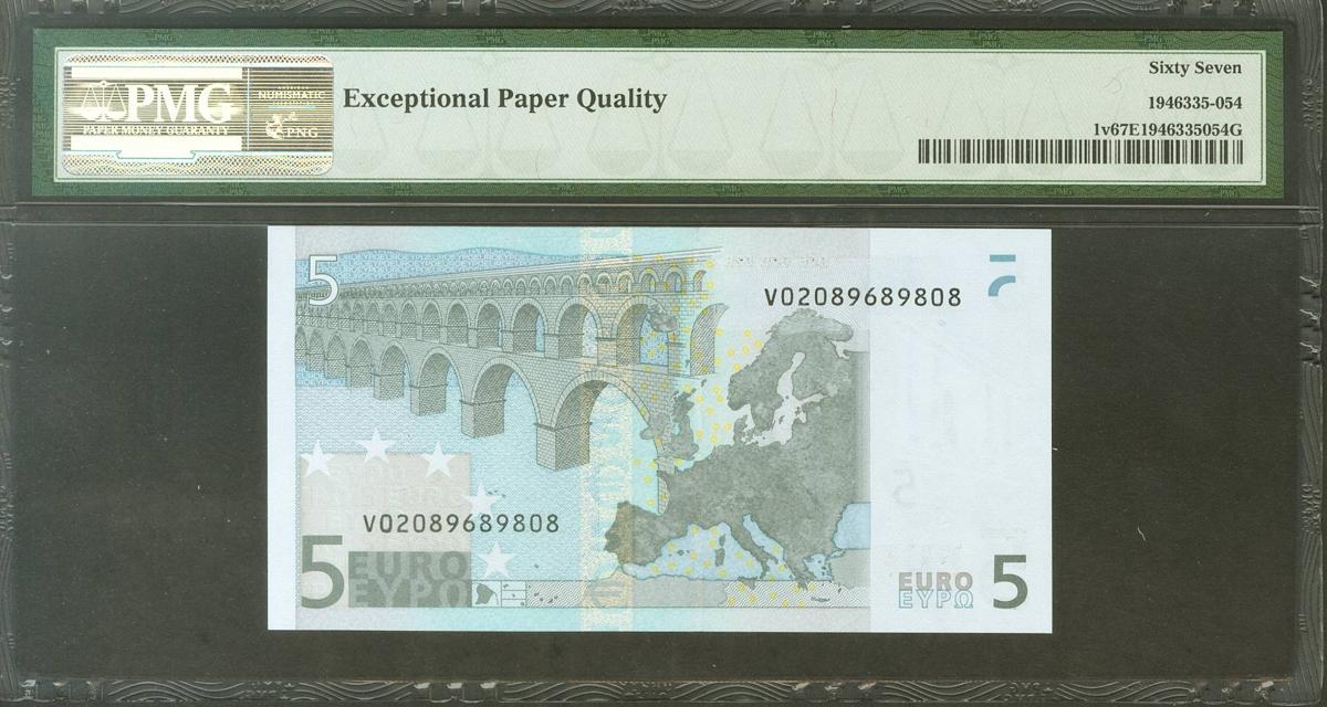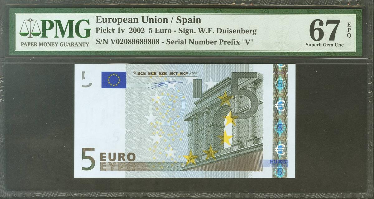 5 Euros. 1 de Enero de 2002. Firma Duisenberg. Serie V (España). (Edifil 2021: 486, Pick: 1v). SC. Encapsulado PMG67EPQ.