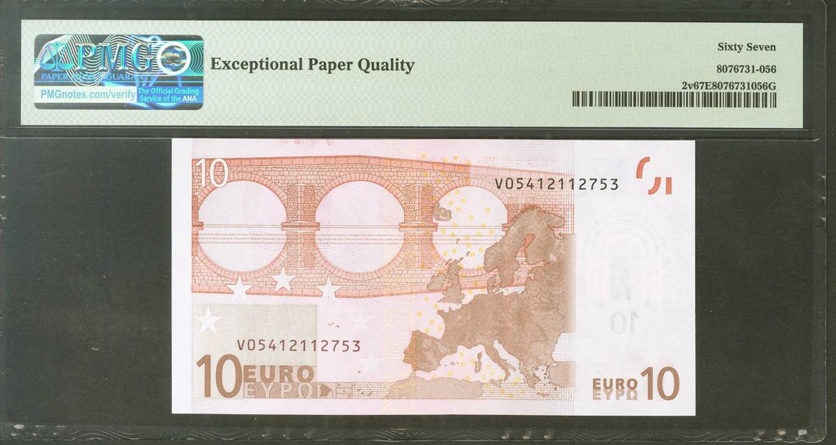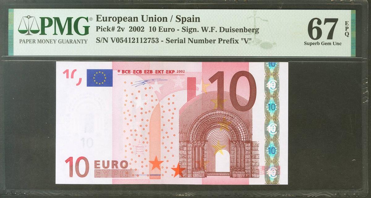 10 Euros. 1 de Enero de 2002. Firma Duisenberg. Serie V (España). (Edifil 2021: 487, Pick: 2v). SC. Encapsulado PMG67EPQ.
