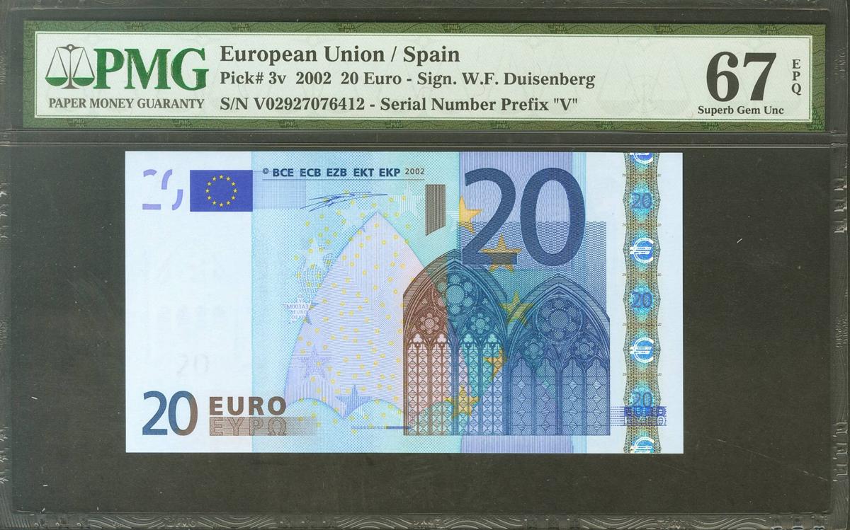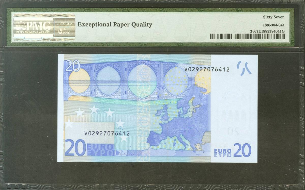 20 Euros. 1 de Enero de 2002. Firma Duisenberg. Serie V (España). (Edifil 2021: 488, Pick: 3v). SC. Encapsulado PMG67EPQ.