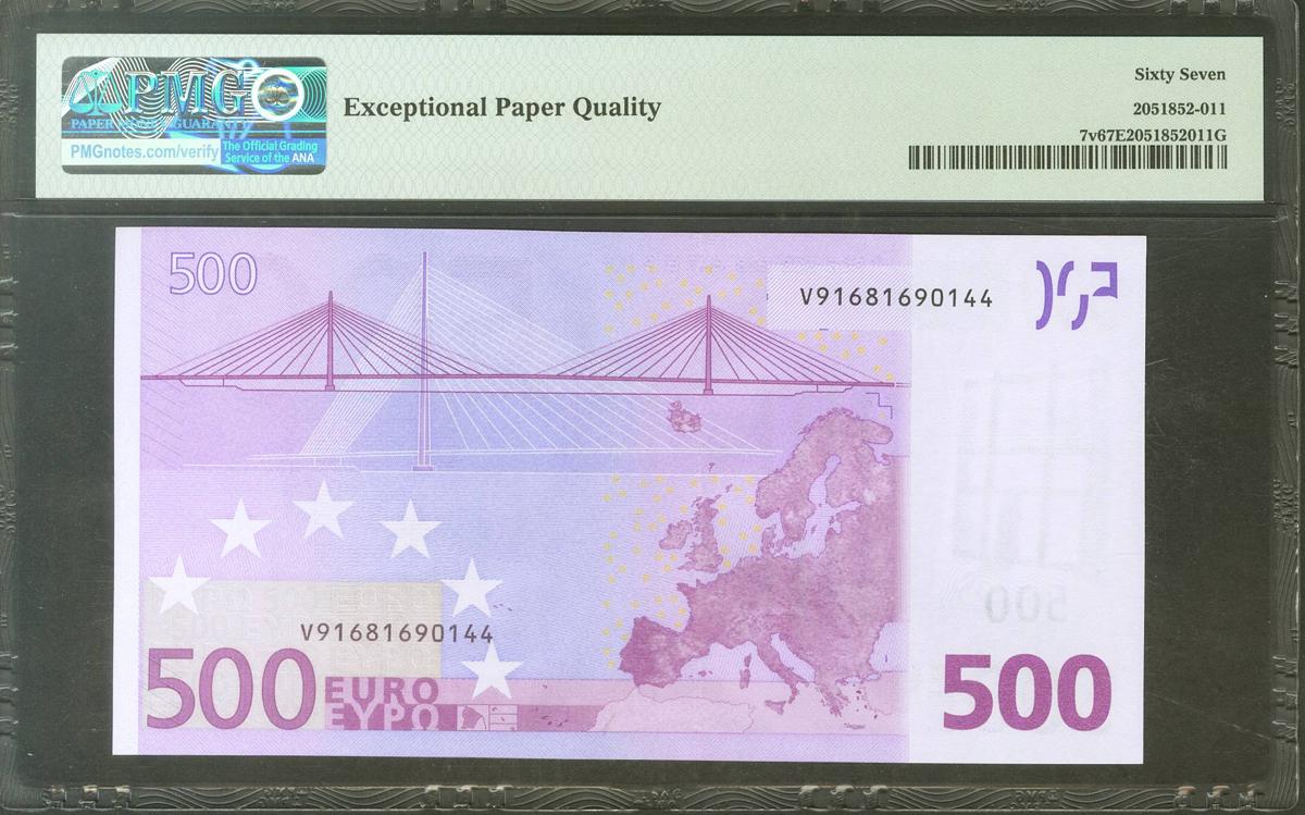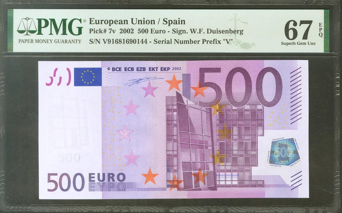 500 Euros. 1 de Enero de 2002. Firma Duisenberg. Serie V (España). (Edifil 2021: 492, Pick: 7v). SC. Encapsulado PMG67EPQ.
