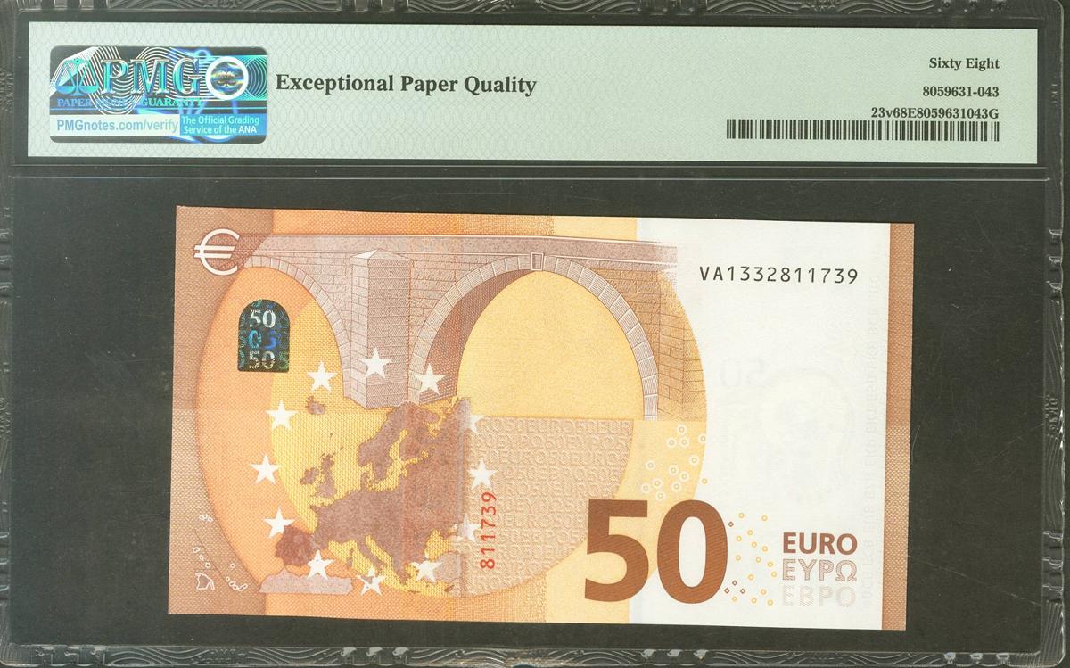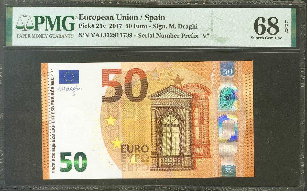 50 Euros. 4 de Abril de 2017. Firma Draghi. Serie V (España). (Edifil 2021: 496, Pick: 23v). SC. Encapsulado PMG68EPQ.