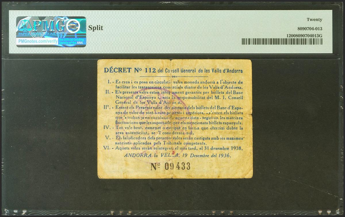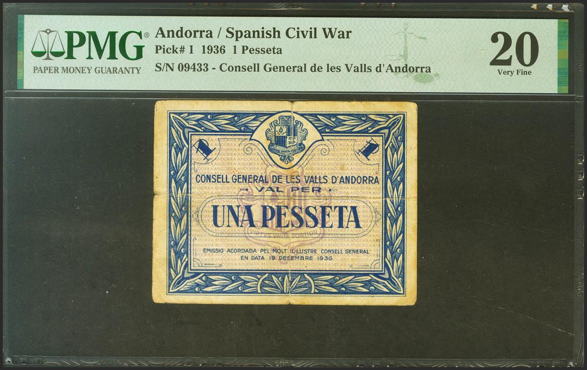 ANDORRA. 1 Pesseta. 19 de Diciembre de 1936. Sin serie. (Edifil 2021: 2, Pick: 1). MBC+. Encapsulado PMG20.