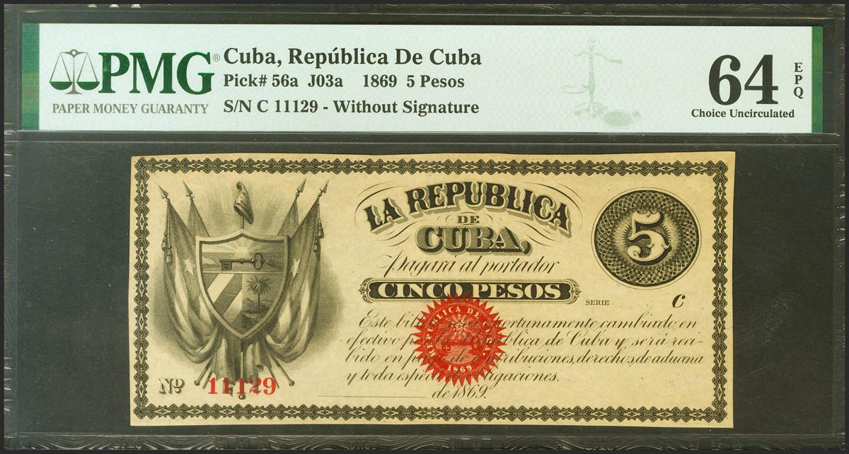 REPUBLICA DE CUBA. 5 Pesos. 1869. Serie C. (Edifil 2021: 32, Pick: 56a). Inusual en esta calidad, apresto original. SC. Encapsulado PMG64EPQ.