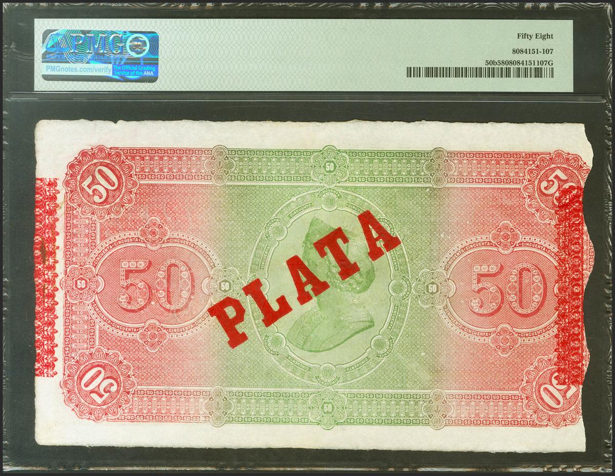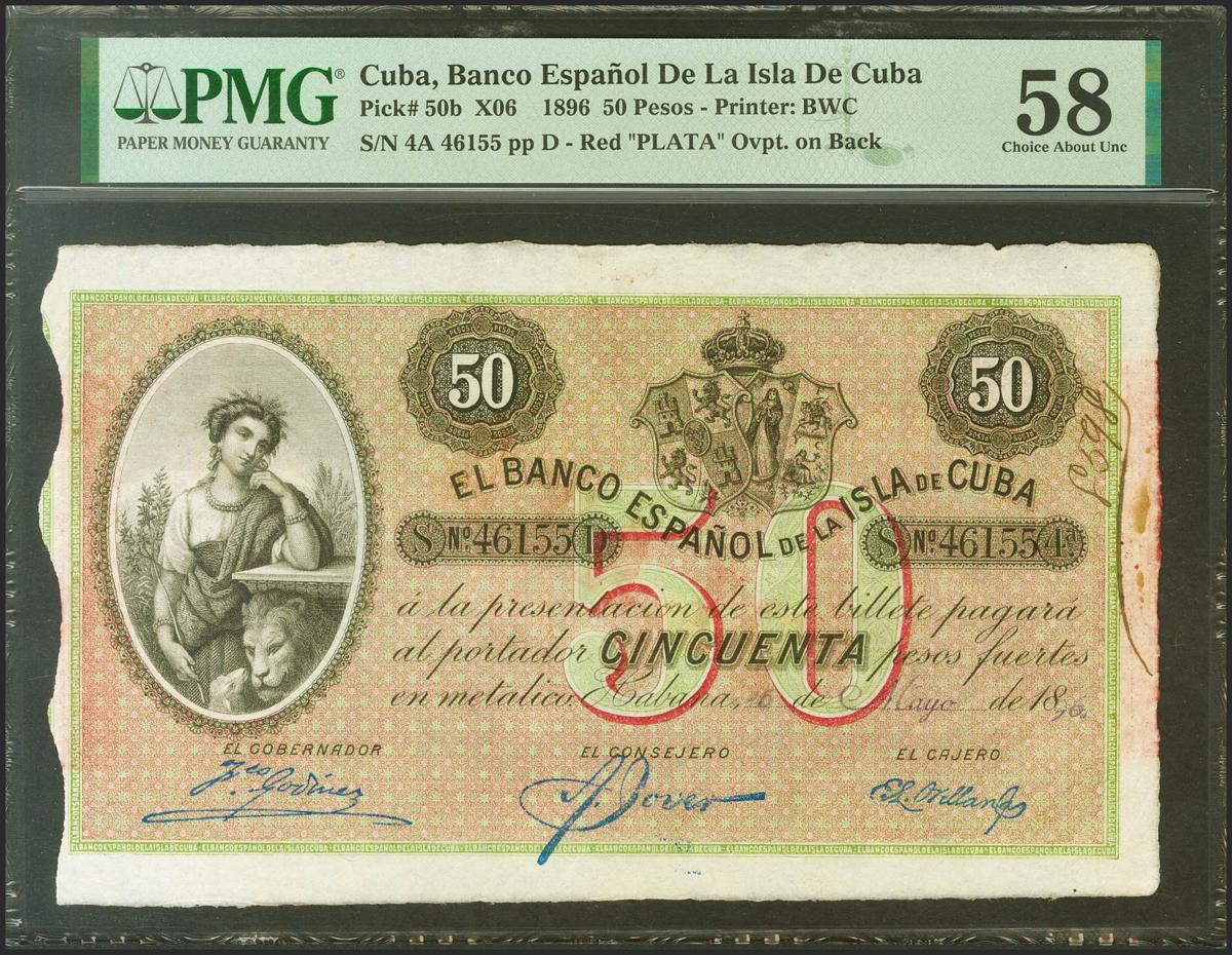 BANCO ESPAÑOL DE LA ISLA DE CUBA. 50 Pesos. 15 de Mayo de 1896. Serie D y con la sobrecarga PLATA, al dorso. (Edifil 2021: 83, Pick: 50b). EBC+. Encapsulado PMG58.