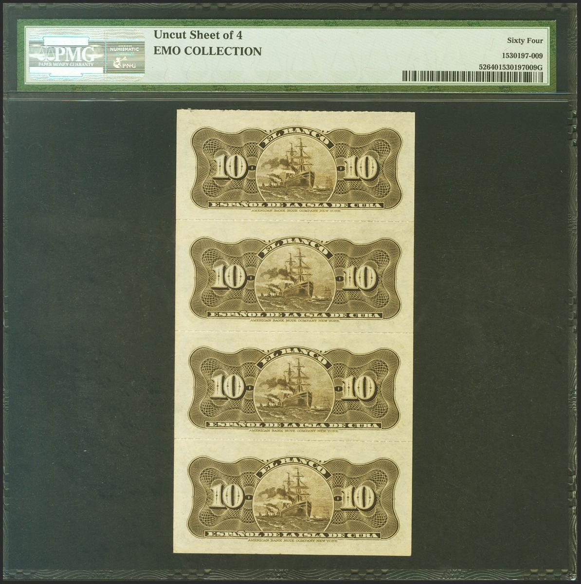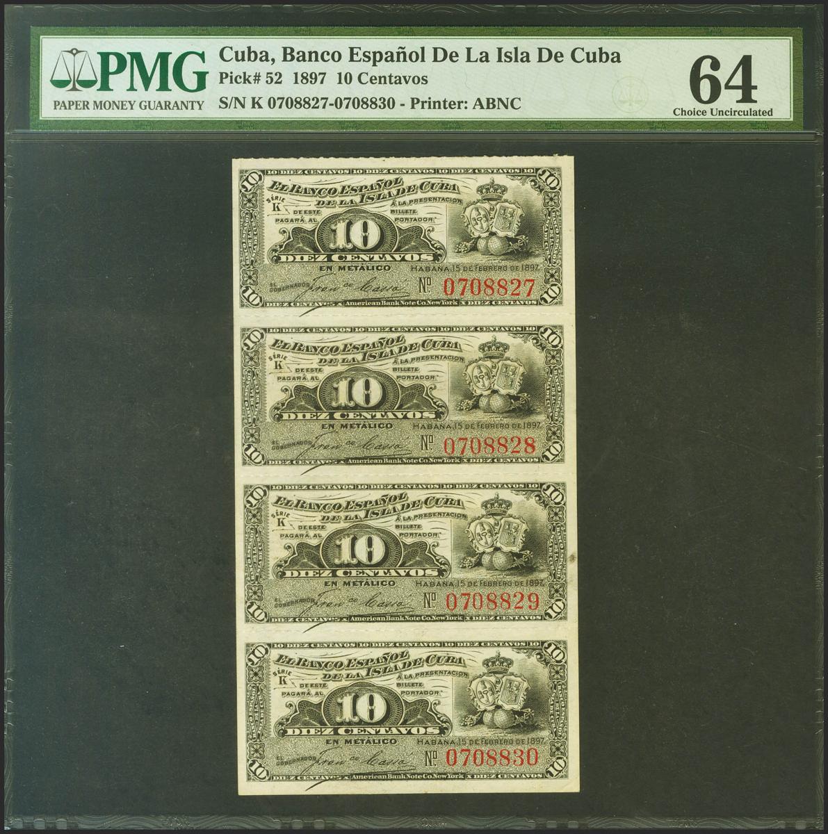 BANCO ESPAÑOL DE LA ISLA DE CUBA. Conjunto de 4 billetes correlativos de 10 Centavos (sin desprender), emitidos el 15 de Febrero de 1897. Serie K. (Edifil 2021: 84, Pick: 52). Inusual. SC. Encapsulado PMG64.