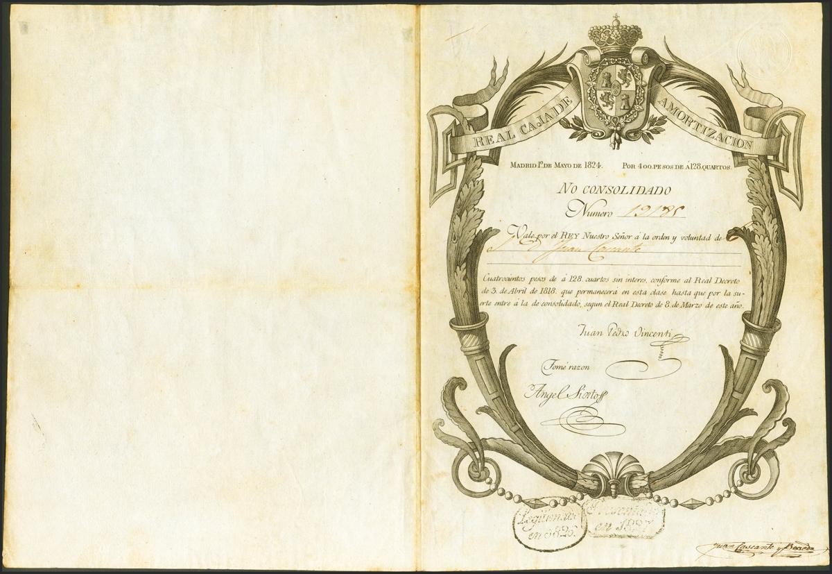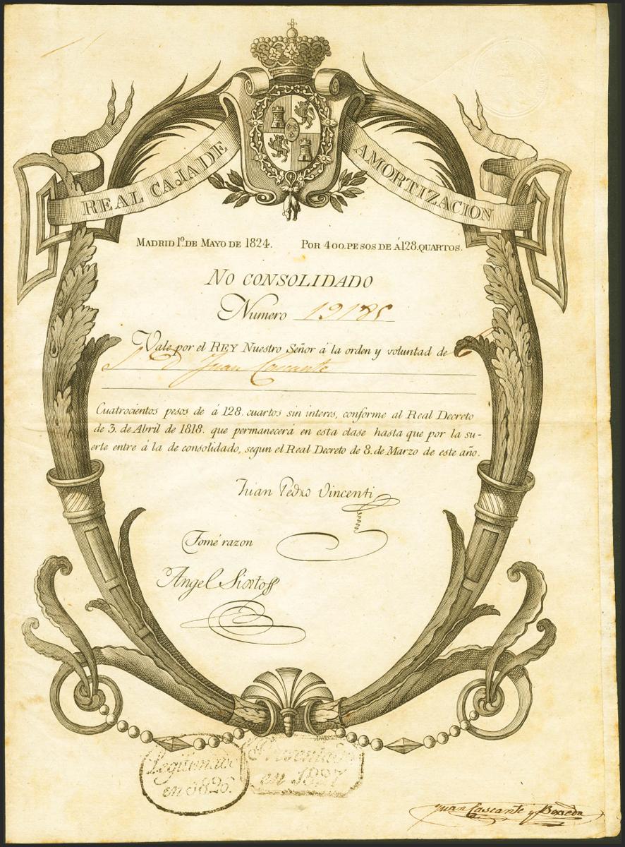 400 Pesos de a 128 Cuartos. 1 de Mayo de 1824. Sin serie y con numeración. (no catalogado en la obra Títulos de la Deuda Pública de la Dirección General del Tesoro, sin duda la obra más importante de este periodo). Extraordinariamente raro vale real. EBC.