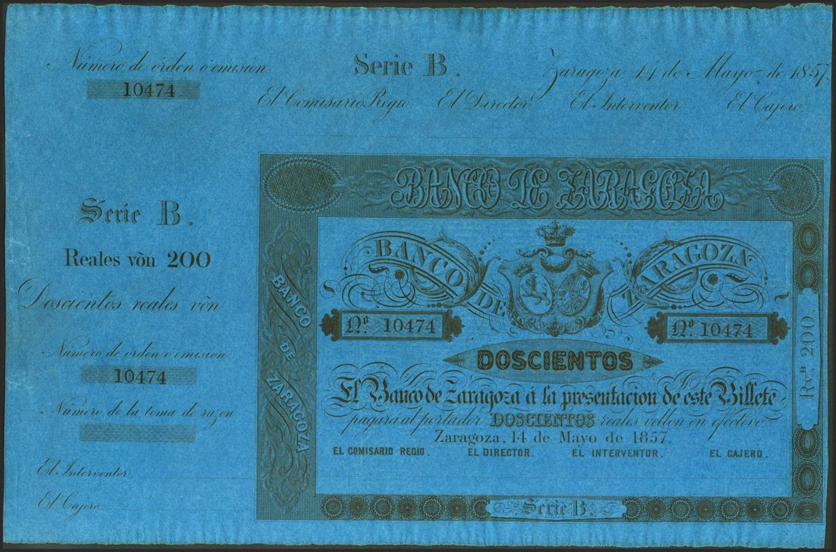 200 Reales. 14 de Mayo de 1857. Banco de Zaragoza. Serie B y con matriz. (Edifil 2021: 127B). Apresto original. SC-.