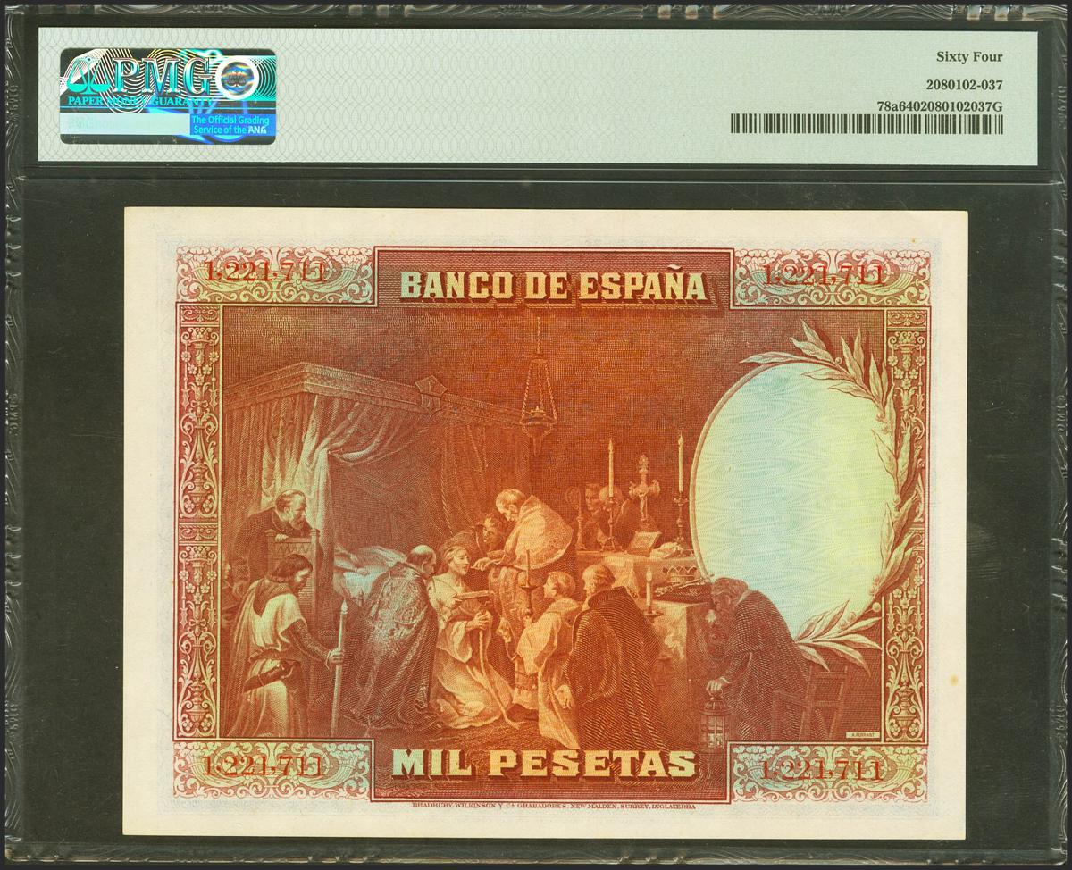 1000 Pesetas. 15 de Agosto de 1928. Sin serie. (Edifil 2021: 357, Pick: 78a). Inusual. SC. Encapsulado PMG64.