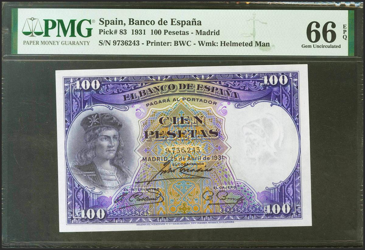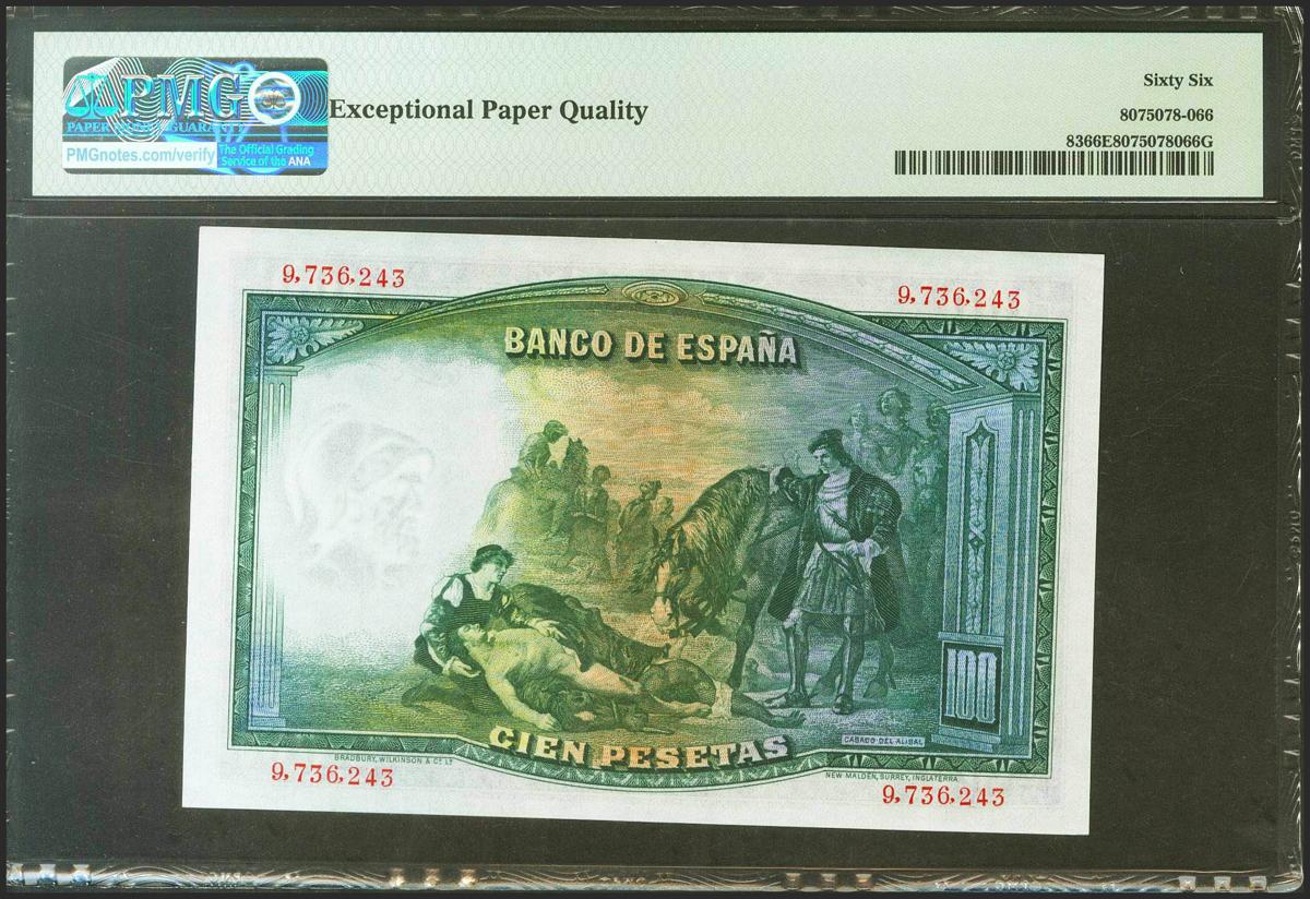 100 Pesetas. 25 de Abril de 1931. Sin serie. (Edifil 2021: 360, Pick: 83). Inusual en esta calidad, apresto original. SC. Encapsulado PMG66EPQ.