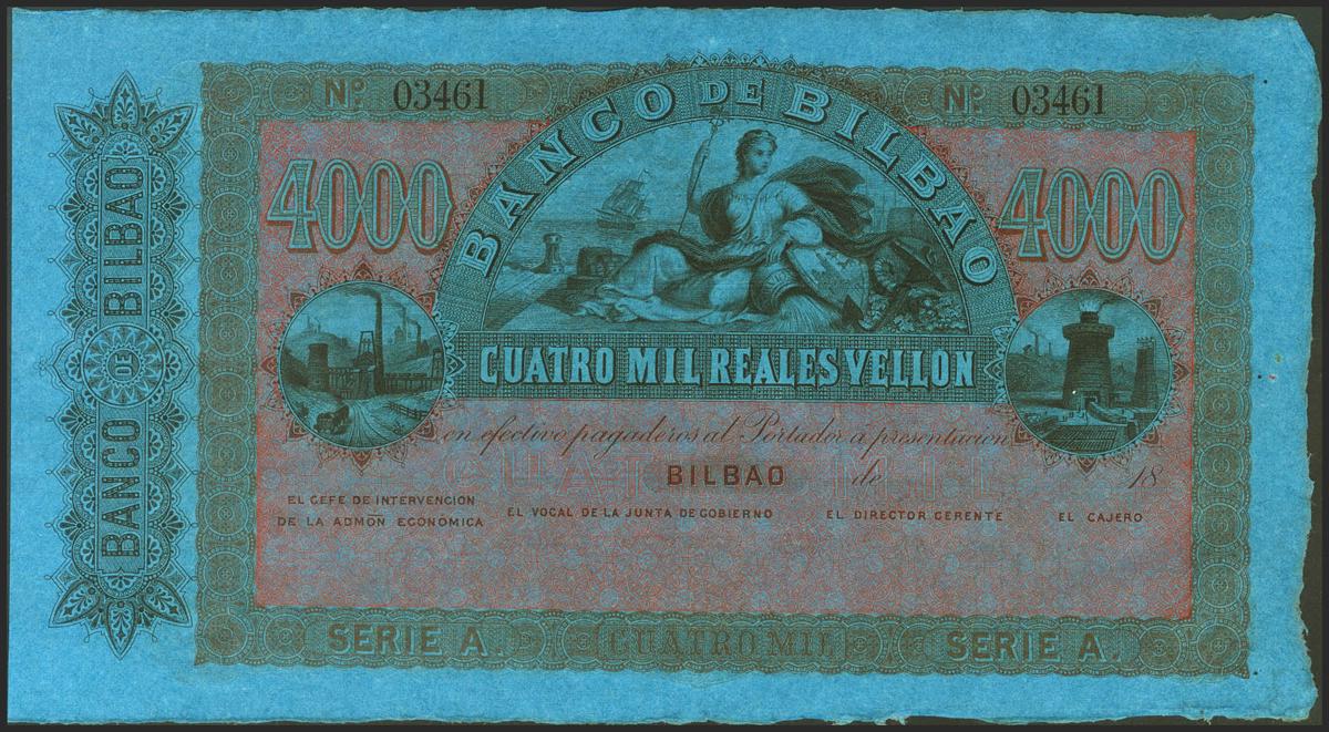 4000 Reales. 21 de Agosto de 1857. Banco de Bilbao. Serie A. Sin firmas y con numeración. (Edifil 2021: 148). Apresto original. SC.