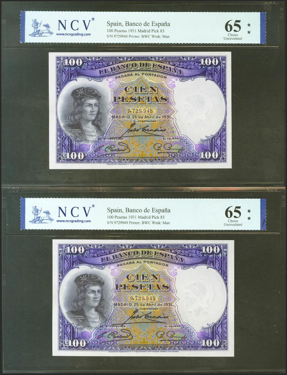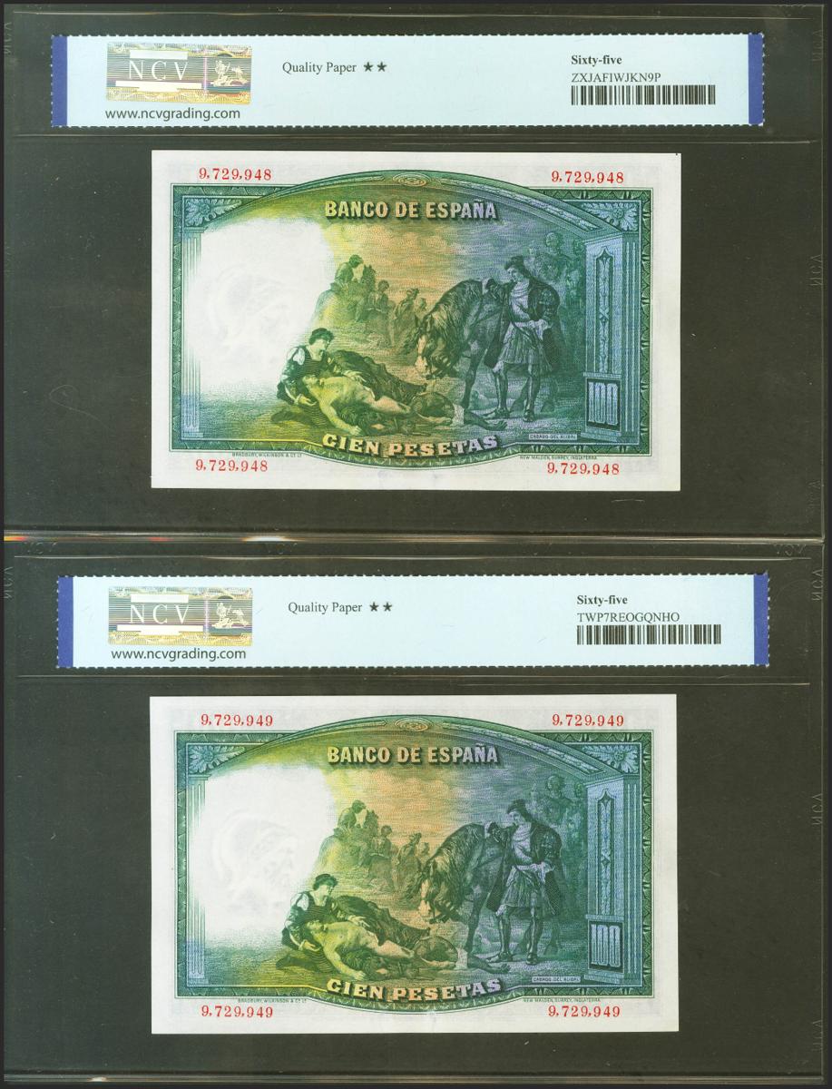 100 Pesetas. 25 de Abril de 1931. Pareja correlativa. Sin serie. (Edifil 2021: 360, Pick: 83). SC. Encapsulados NCV65, ambos.