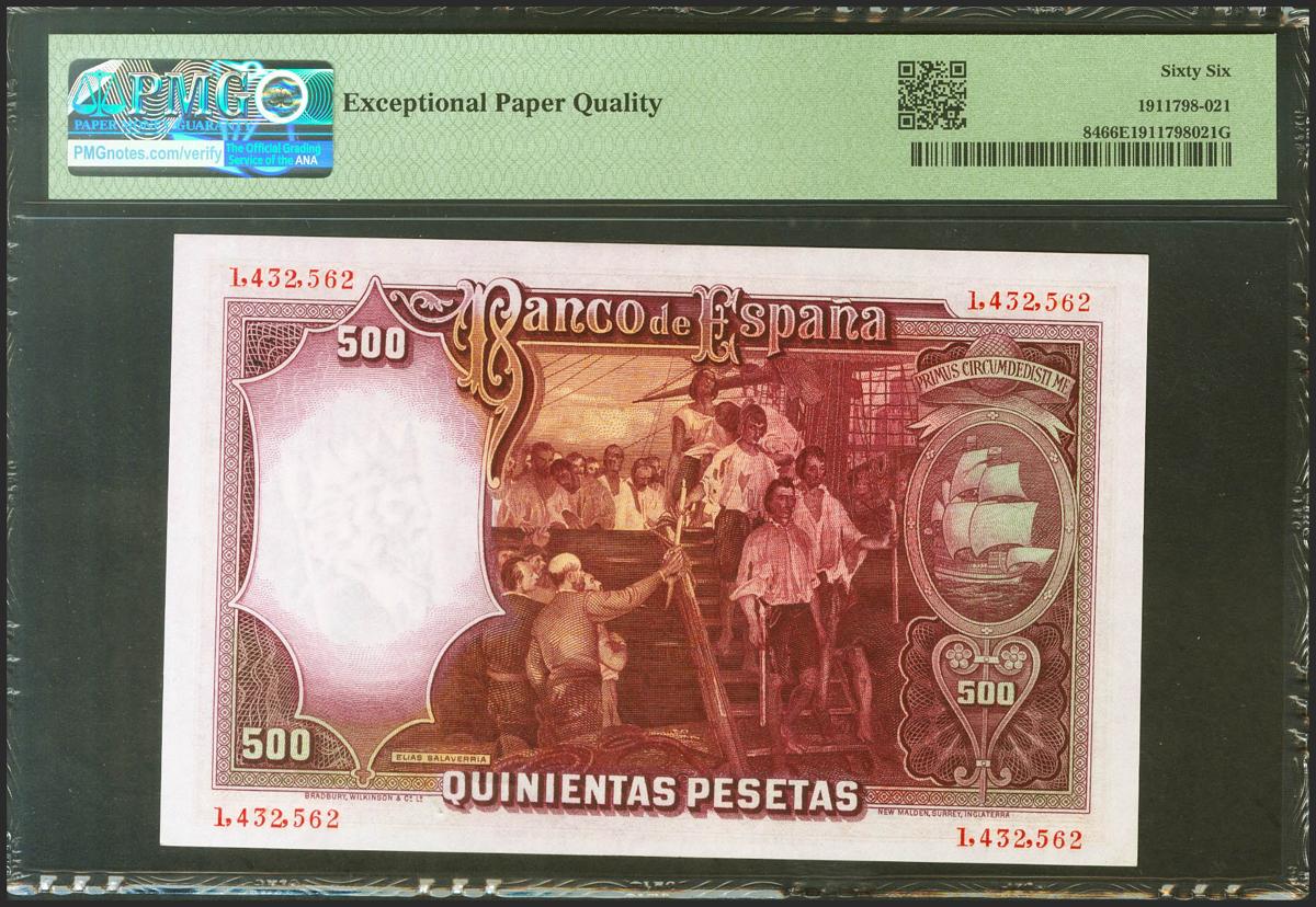 500 Pesetas. 25 de Abril de 1931. Sin serie. (Edifil 2021: 361, Pick: 84). Raro en esta calidad, apresto original. SC. Encapsulado PMG66EPQ.