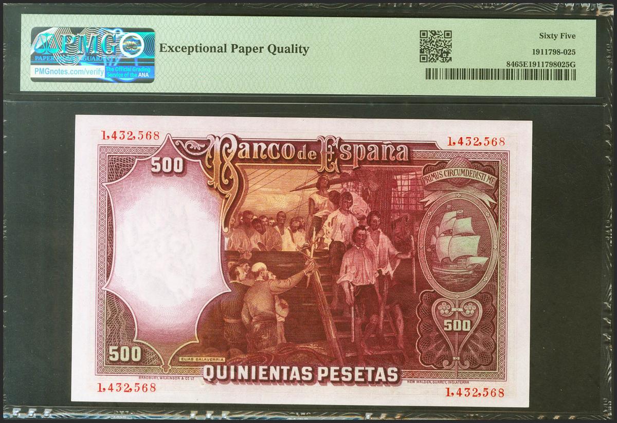 500 Pesetas. 25 de Abril de 1931. Sin serie. (Edifil 2021: 361, Pick: 84). Inusual en esta calidad, apresto original. SC. Encapsulado PMG65EPQ.