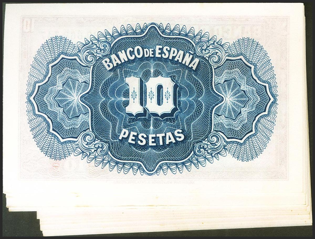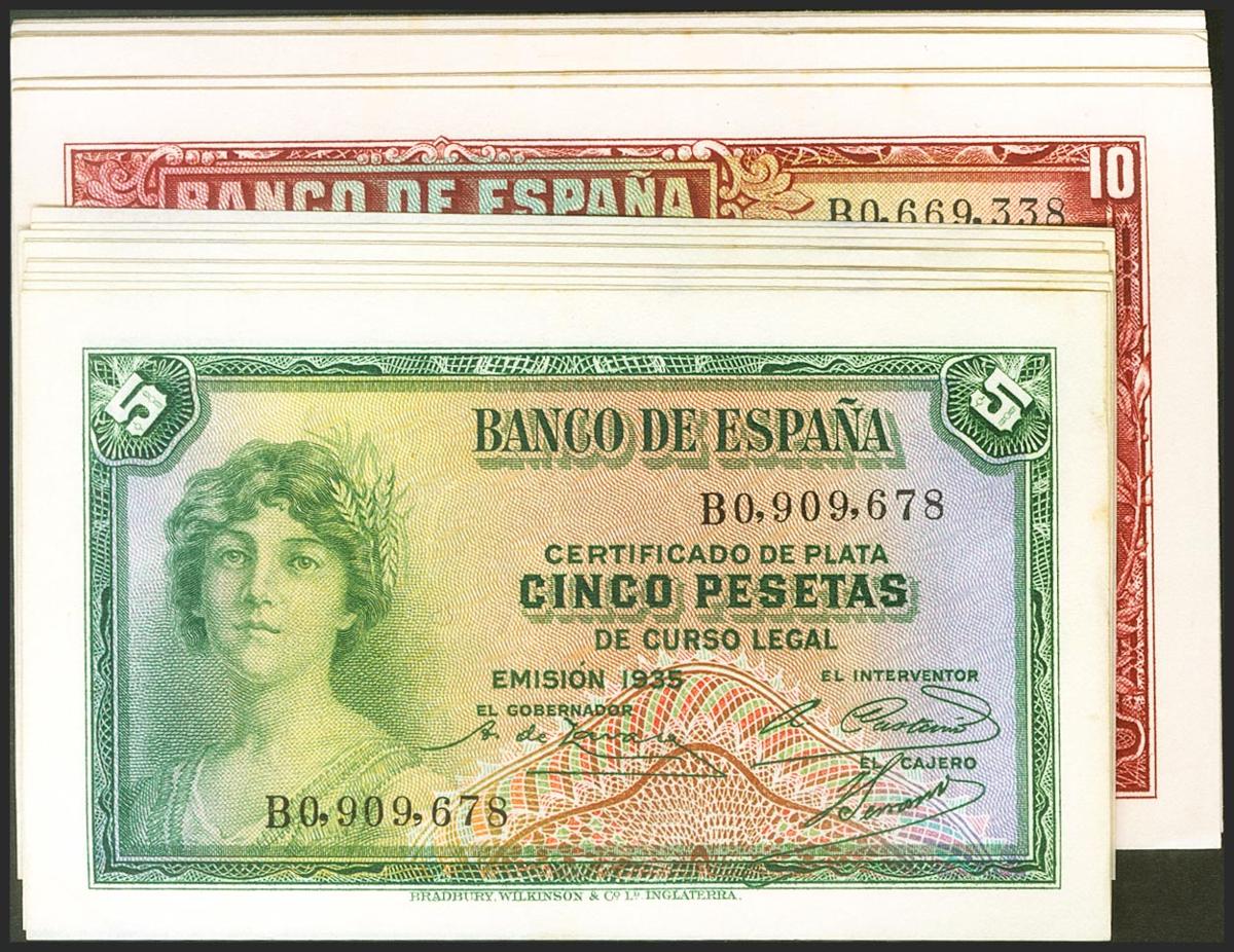 Conjunto de 10 billetes correlativos de 5 Pesetas y 10 Pesetas Certificado de Plata, emitidos en 1935 y ambos con las series B (Edifil 2021: 2021: 363a, 364a), conservando todo su apresto original. SC/SC-.