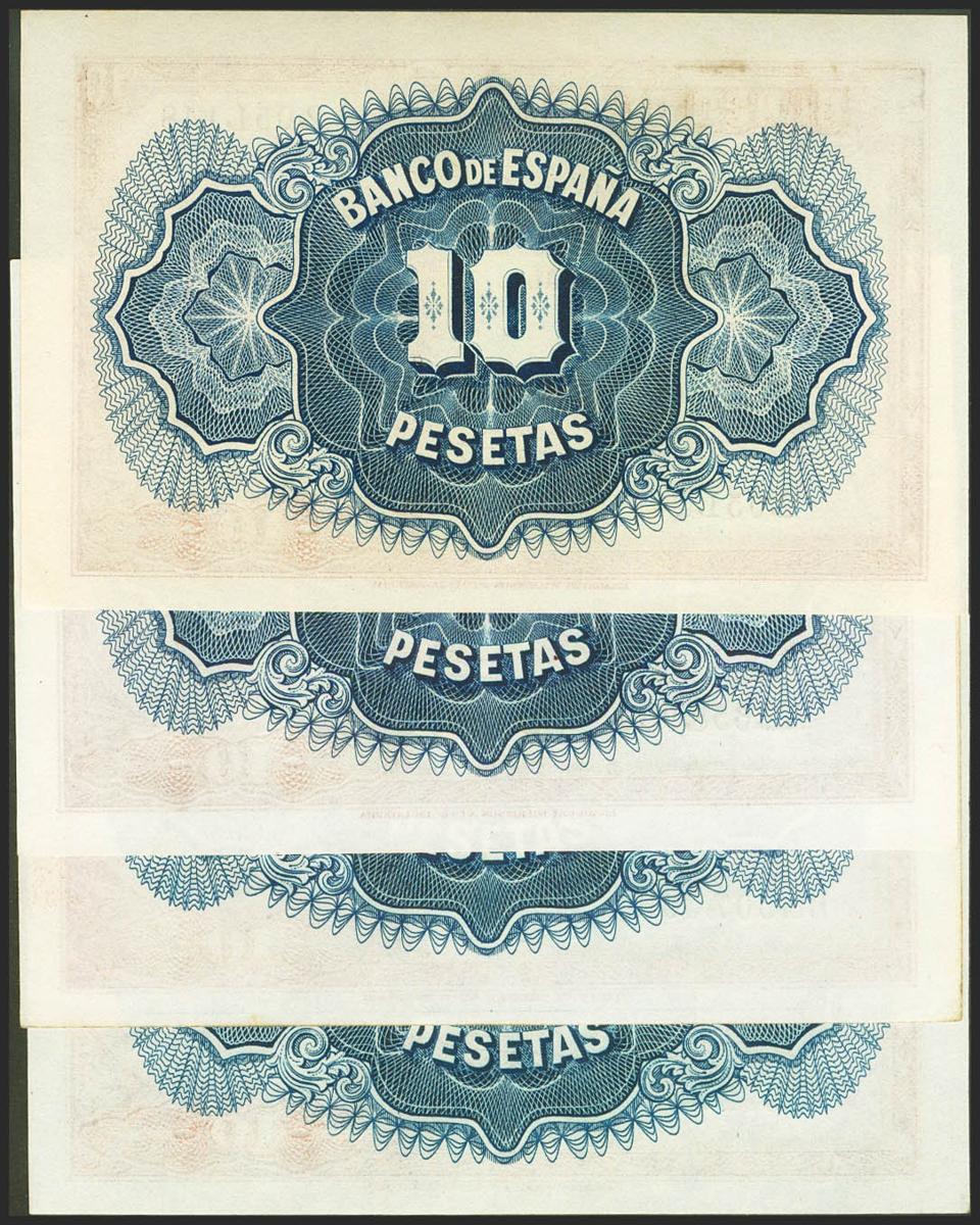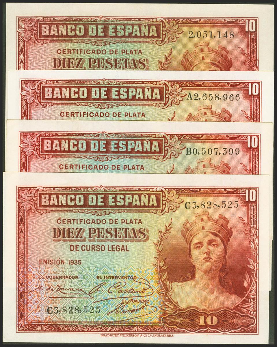 Conjunto de 4 billetes de 10 Pesetas Certificado de Plata emitidos en 1935, sin serie y con las series A, B y C (Edifil 2021: 364, 364a), conservando su apresto original. SC-/SC--.