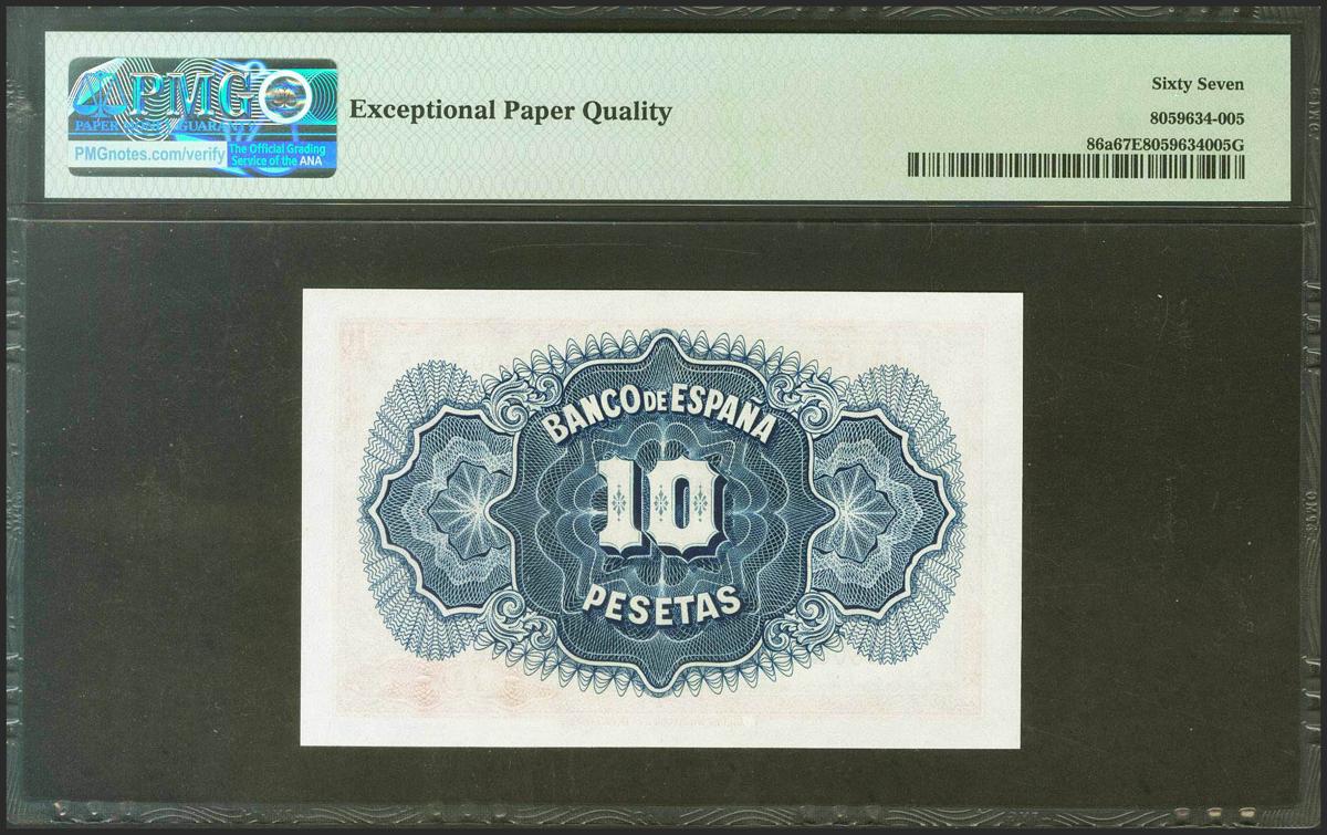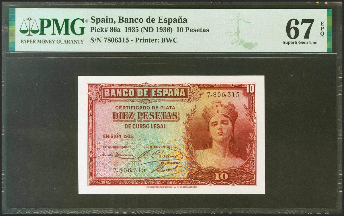 10 Pesetas. 1935. Certificado de Plata. Sin serie. (Edifil 2021: 364, 86a). Raro en esta excepcional calidad, apresto original. SC. Encapsulado PMG67EPQ.