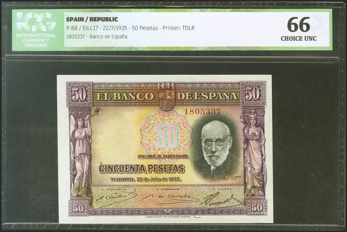 50 Pesetas. 22 de Julio de 1935. Sin serie. (Edifil 2021: 366, Pick: 88a). Inusual en esta excepcional calidad. SC. Encapsulado ICG66.