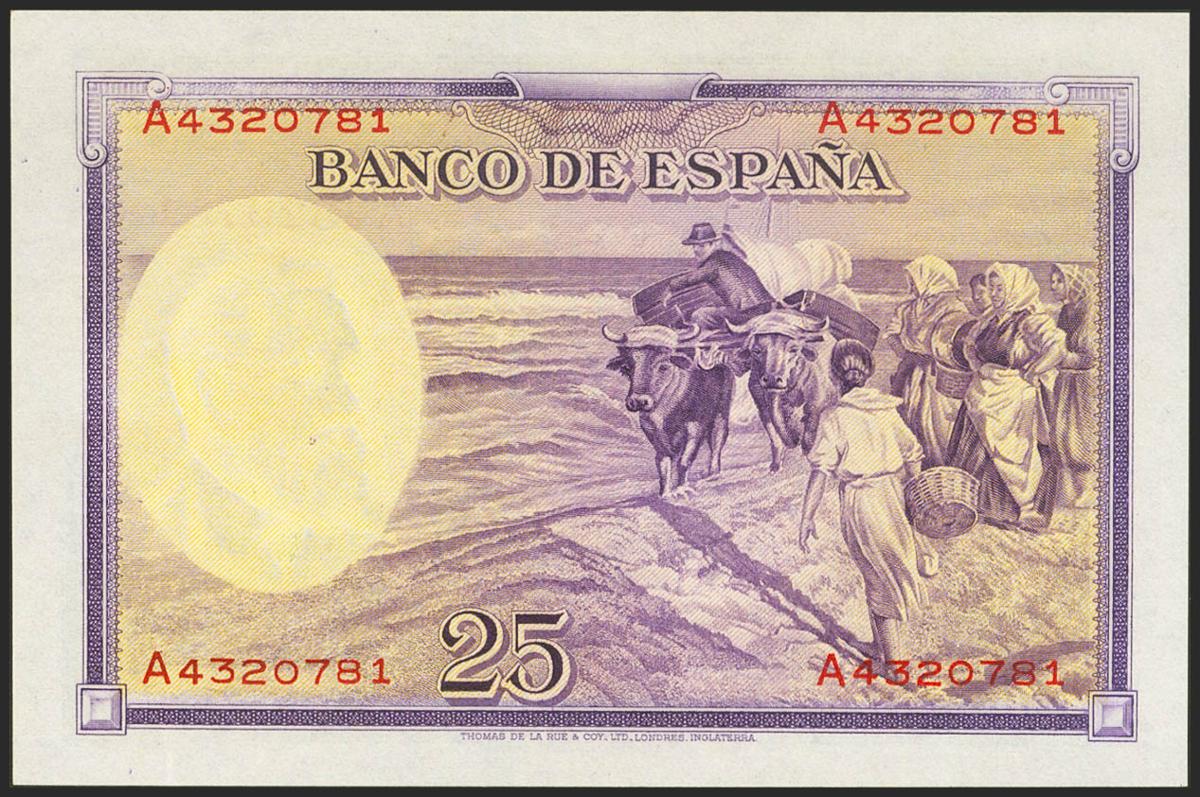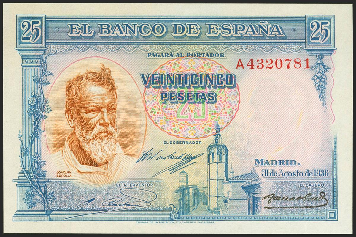25 Pesetas. 31 de Agosto de 1936. Serie A. (Edifil 2021: 367a). Conserva todo su apresto original. SC.