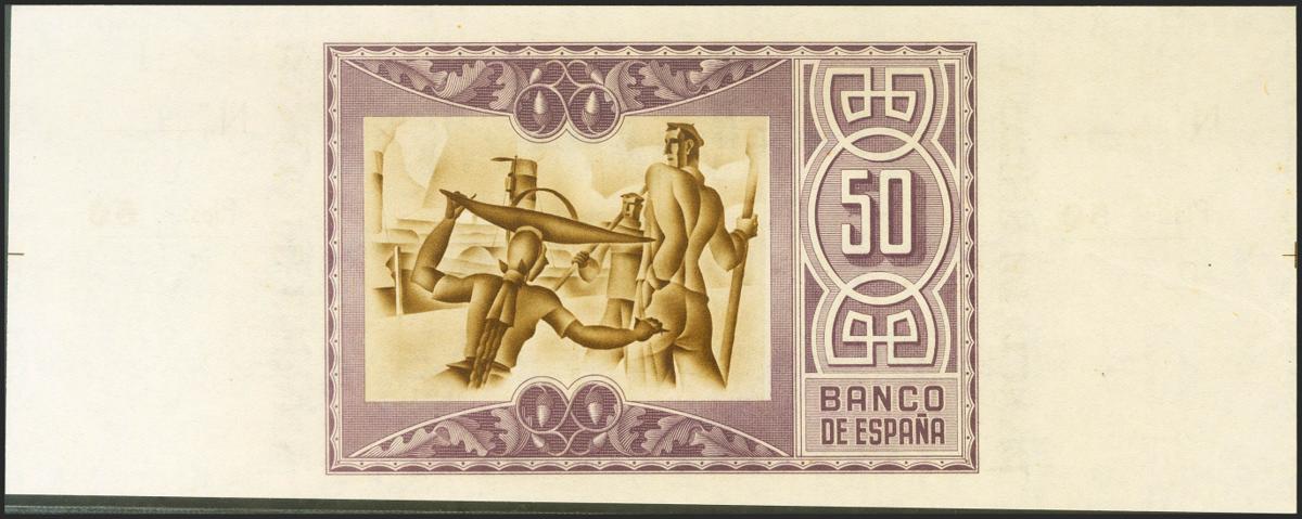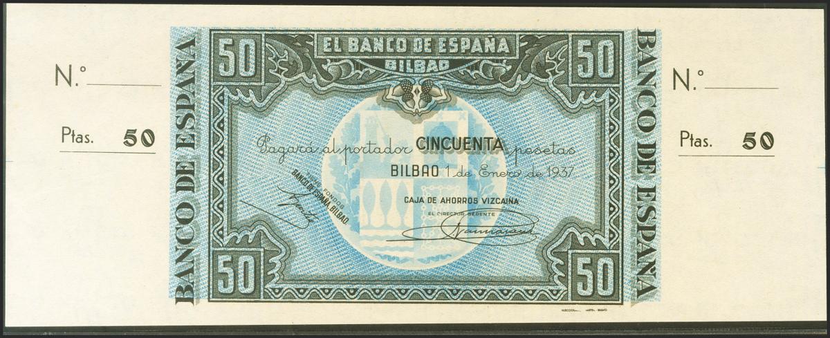 50 Pesetas. 1 de Enero de 1937. Sucursal de Bilbao, antefirma Banco Ahorros Vizcaína. Sin serie y sin numeración, con ambas matrices. (Edifil 2021: 389f). Apresto original. SC--.