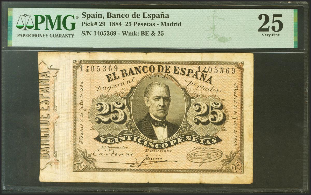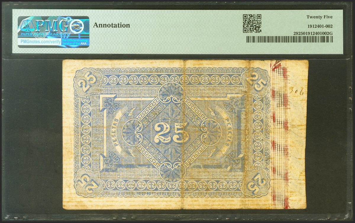25 Pesetas. 1 de Julio de 1884. Sin serie. (Edifil 2021: 287, Pick: 29). Raro, especialmente sin reparaciones y al reverso anotación. MBC. Encapsulado PMG25 (annotation).