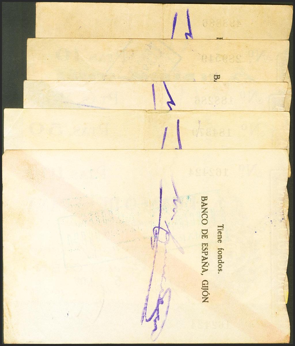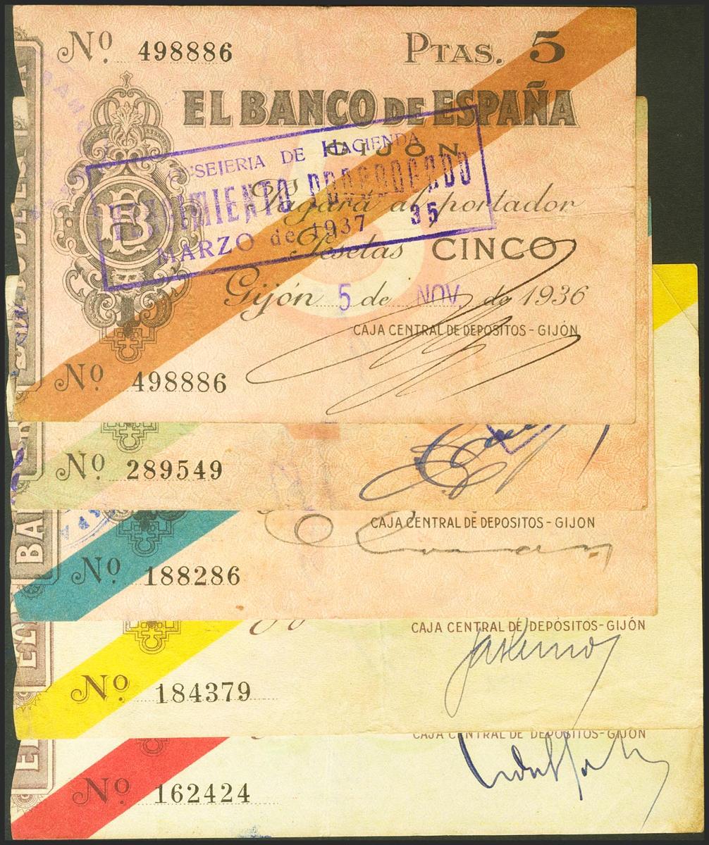 Conjunto de 5 billetes de 5 Pesetas, 10 Pesetas, 25 Pesetas, 50 Pesetas y 100 Pesetas emitidos por la sucursal de Gijón el 5 de Noviembre de 1936. (Edifil 2021: 380/84). Conjunto de enorme calidad, recordamos que estos billetes muy raramente se encuentran en calidades altas. EBC-/MBC+.